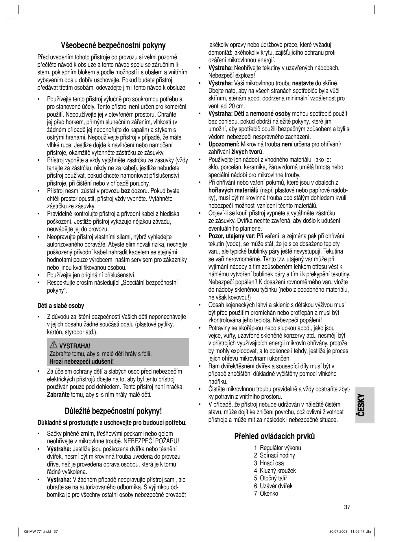 jakékoliv opravy nebo údržbové práce, které vyžadují demontáž jakéhokoliv krytu, zajišťujícího ochranu proti ozáření mikrovlnnou energií. Výstraha: Neohřívejte tekutiny v uzavřených nádobách. Nebezpečí exploze! Výstraha: Vaši mikrovlnnou troubu nestavte do skříně. Dbejte nato, aby na všech stranách spotřebiče byla vůči skříním, stěnám apod. dodržena minimální vzdálenost pro ventilaci 20 cm. Výstraha: Děti a nemocné osoby mohou spotřebič použít bez dohledu, pokud obdrží náležité pokyny, které jim umožní, aby spotřebič použili bezpečným způsobem a byli si vědomi nebezpečí nesprávného zacházení. Upozornění: Mikrovlná trouba není určena pro ohřívání/ zahřívání živých tvorů. Používejte jen nádobí z vhodného materiálu, jako je: sklo, porcelán, keramika, žáruvzdorná umělá hmota nebo speciální nádobí pro mikrovlnné trouby. Při ohřívání nebo vaření pokrmů, které jsou v obalech z hořlavých materiálů (např. plastové nebo papírové nádobky), musí být mikrovlnná trouba pod stálým dohledem kvůli nebezpečí možnosti vznícení těchto materiálů. Objeví-li se kouř, přístroj vypněte a vytáhněte zástrčku ze zásuvky. Dvířka nechte zavřená, aby došlo k udušení eventuálního plamene. Pozor, utajený var: Při vaření, a zejména pak při ohřívání tekutin (voda), se může stát, že je sice dosaženo teploty varu, ale typické bublinky páry ještě nevystupují. Tekutina se vaří nerovnoměrně. Tento tzv. utajený var může při vyjímání nádoby a tím způsobeném lehkém otřesu vést k náhlému vytvoření bublinek páry a tím i k překypění tekutiny. Nebezpečí popálení! K dosažení rovnoměrného varu vložte do nádoby skleněnou tyčinku (nebo z podobného materiálu, ne však kovovou!) Obsah kojeneckých lahví a sklenic s dětskou výživou musí být před použitím promíchán nebo protřepán a musí být zkontrolována jeho teplota. Nebezpečí popálení! Potraviny se skořápkou nebo slupkou apod., jako jsou vejce, vuřty, uzavřené skleněné konzervy atd., nesmějí být v přístrojích využívajících energii mikrovln ohřívány, protože by mohly explodovat, a to dokonce i tehdy, jestliže je proces jejich ohřevu mikrovlnami ukončen. Rám dvířek/těsnění dvířek a sousedící díly musí být v případě znečištění důkladně vyčištěny pomocí vlhkého hadříku. Čistěte mikrovlnnou troubu pravidelně a vždy odstraňte zbytky potravin z vnitřního prostoru. V případě, že přístroj nebude udržován v náležitě čistém stavu, může dojít ke zničení povrchu, což ovlivní životnost přístroje a může mít za následek i nebezpečné situace.