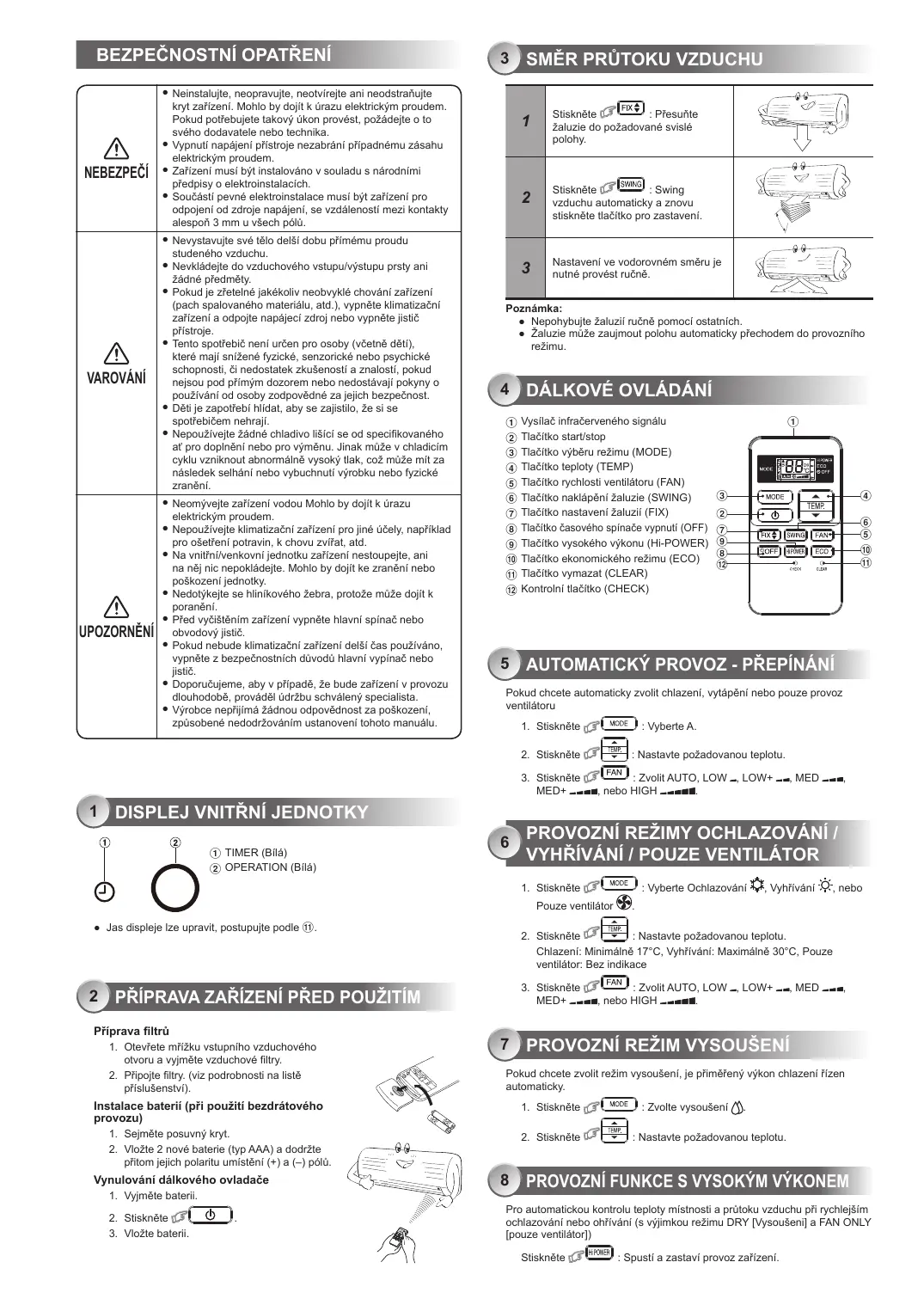 DÁLKOVÉ OVLÁDÁNÍ Vysílač infračerveného signálu Tlačítko start/stop Tlačítko výběru režimu (MODE) Tlačítko teploty (TEMP) Tlačítko rychlosti ventilátoru (FAN) Tlačítko naklápění žaluzie (SWING) Tlačítko nastavení žaluzií (FIX) Tlačítko časového spínače vypnutí (OFF) Tlačítko vysokého výkonu (Hi-POWER) Tlačítko ekonomického režimu (ECO) Tlačítko vymazat (CLEAR) Kontrolní tlačítko (CHECK)