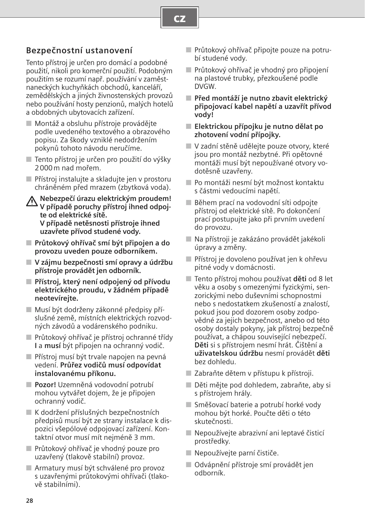 A fault, what to do? Attention! Repairs must only be carried out by an authorised technician. Improper repairs can lead to risk of serious injury to the user. If your appliance does not operate as required, it is often due to a very minor problem. Please check whether you can remedy the fault yourself by using the following guidelines. You will save yourself the costs of an unnecessary visit by customer service personnel. ■ Monter et utiliser l’appareil comme indiqué dans le texte et à l’écran. Nous n’assumons aucune garantie pour les risques susceptibles de survenir en cas de non-respect de cette notice. ■ Cet appareil est destiné à une utilisation jusqu’à une hauteur maximale de 2 000 m au-dessus du niveau de la mer. ■ Toujours installer et stocker l’appareil dans une pièce à l’abri du gel (eau résiduelle). Danger de choc électrique ! En cas d’erreur, déconnectez immédiatement la tension du secteur. En cas de fuite sur l’appareil, immédiatement couper l’alimentation en eau froide. ■ Seul un installateur agréé est autorisé à raccorder et à mettre en marche le chauffe-eau instantané. ■ Pour éviter tous risques, seul un spécialiste a le droit d’effectuer des travaux de réparation et de maintenance. ■ Nʼouvrez jamais l’appareil sans avoir interrompu l’apport de courant à l’appareil. ■ Respectez les prescriptions légales en vigueur dans votre pays ainsi que celles recommandées par les compagnies locales/ nationales distributrices d’électricité et d’eau et applicables dans votre localité. ■ Le chauffe-eau instantané est un appareil qui répond à la classe de protection I. Il doit être raccordé au fil de terre. ■ L’appareil doit être raccordé de manière durable aux conduites d’eau posées de manière fixe. La section de câble doit correspondre à la puissance à installer. ■ Exemple : les conduites d’eau mises à la terre peuvent simuler la présence d’un fil de terre.