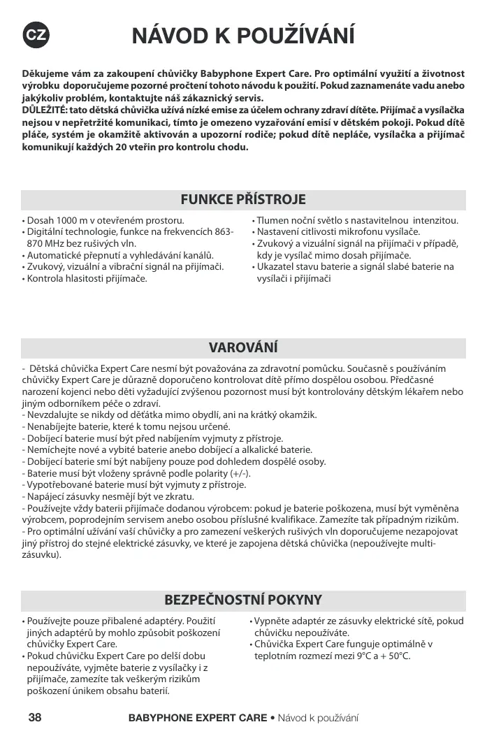 Děkujeme vám za zakoupení chůvičky Babyphone Expert Care. Pro optimální využití a životnost výrobku doporučujeme pozorné pročtení tohoto návodu k použití. Pokud zaznamenáte vadu anebo jakýkoliv problém, kontaktujte náš zákaznický servis. DŮLEŽITÉ: tato dětská chůvička užívá nízké emise za účelem ochrany zdraví dítěte. Přijímač a vysílačka nejsou v nepřetržité komunikaci, tímto je omezeno vyzařování emisí v dětském pokoji. Pokud dítě pláče, systém je okamžitě aktivován a upozorní rodiče; pokud dítě nepláče, vysílačka a přijímač komunikují každých 20 vteřin pro kontrolu chodu.
