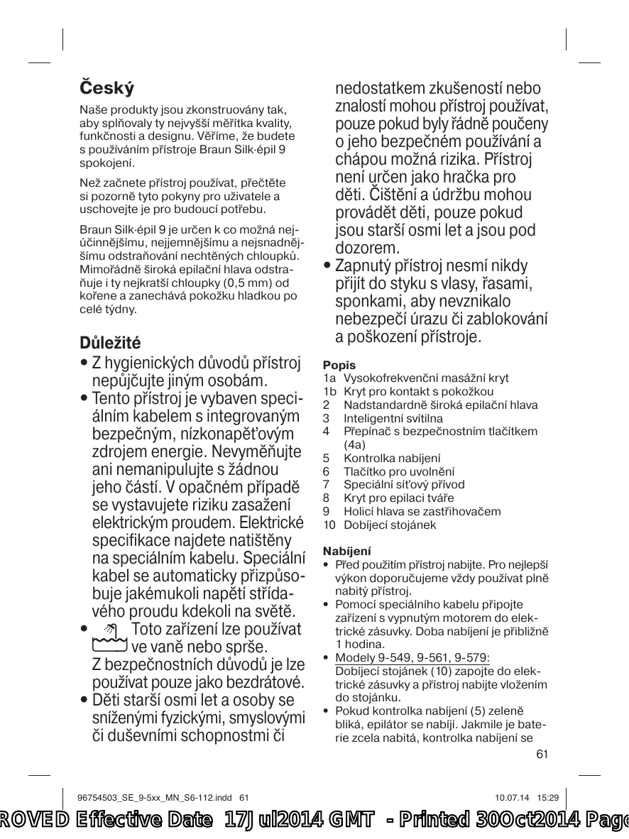 ROVED Effective Date 17Jul2014 GMT - Printed 30Oct2014 Page Český Naše produkty jsou zkonstruovány tak, aby splňovaly ty nejvyšší měřítka kvality, funkčnosti a designu. Věříme, že budete s používáním přístroje Braun Silk·épil 9 spokojení. Než začnete přístroj používat, přečtěte si pozorně tyto pokyny pro uživatele a uschovejte je pro budoucí potřebu. Braun Silk·épil 9 je určen k co možná nejúčinnějšímu, nejjemnějšímu a nejsnadnějšímu odstraňování nechtěných chloupků. Mimořádně široká epilační hlava odstraňuje i ty nejkratší chloupky (0,5 mm) od kořene a zanechává pokožku hladkou po celé týdny. Důležité