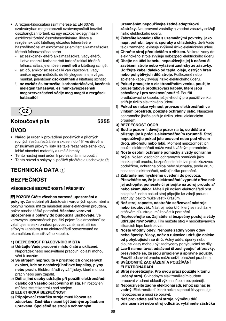 09.12.2013 HLUČNOSTI/VIBRACÍ • Měřeno podle EN 60745 činí tlak hlukové vlny tohoto přístroje 97 dB(A) a dávka hlučnosti 108 dB(A) (standardní odchylka: 3 dB), a vibrací ✱ m/s² (metoda ruka-paže; nepřesnost K = 1,5 m/s²) ✱ při řezání dřeva 2,6 m/s² ✱ při řezání kovů 2,2 m/s² • Úroveň vibrací byla měřena v souladu se standardizovaným testem podle EN 60745; je možné ji použít ke srovnání jednoho přístroje s druhým a jako předběžné posouzení vystavování se vibracím při používání přístroje k uvedeným aplikacím - používání přístroje k jiným aplikacím nebo s jiným či špatně udržovaným příslušenstvím může zásadně zvýšit úroveň vystavení se vibracím - doba, kdy je přístroj vypnutý nebo kdy běží, ale ve skutečnosti není využíván, může zásadně snížit úroveň vystavení se vibracím ! chraňte se před následky vibrací tak, že budete dbát na údržbu přístroje a příslušenství, budete si udržovat teplé ruce a uspořádáte si své pracovní postupy