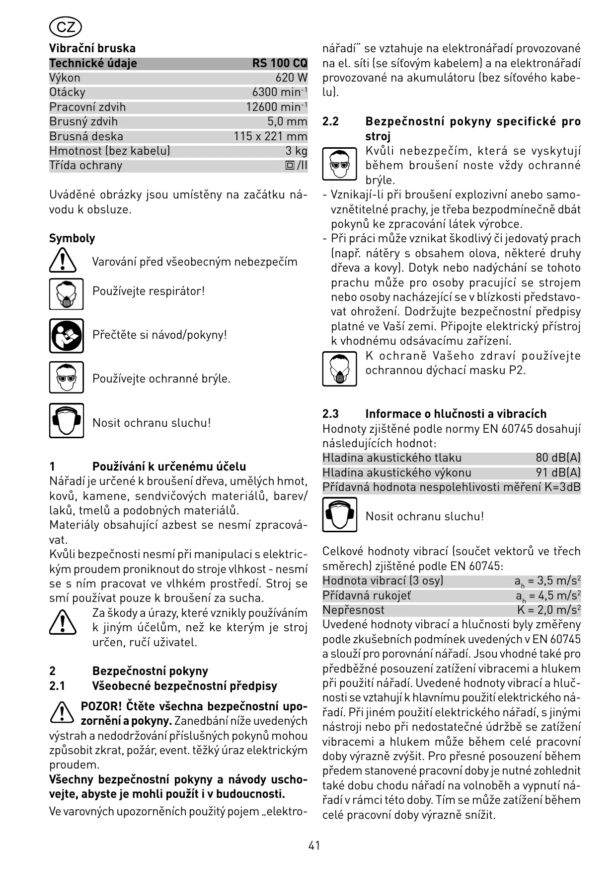 Les valeurs typiques obtenues selon EN 60745 sont les suivantes : Niveau de pression acoustique 80 dB(A) Niveau de puissance sonore 91 dB(A) Majoration pour incertitude de mesure K = 3 dB Pour des raisons de sécurité électrique, cette machine ne doit pas être humide ni être utilisée dans un environnement humide. Cette machine ne doit être utilisée que pour un polissage à sec. L‘utilisateur est responsable des dégâts ou accidents qu‘il peut provoquer en ne respectant pas les dispositions de sécurité.