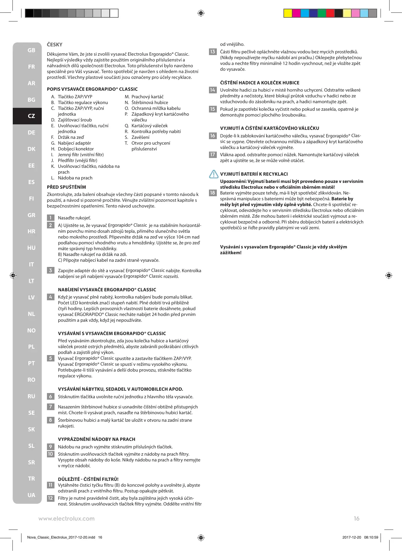 ČESKY Děkujeme Vám, že jste si zvolili vysavač Electrolux Ergorapido® Classic. Nejlepší výsledky vždy zajistíte použitím originálního příslušenství a náhradních dílů společnosti Electrolux. Toto příslušenství bylo navrženo speciálně pro Váš vysavač. Tento spotřebič je navržen s ohledem na životní prostředí. Všechny plastové součásti jsou označeny pro účely recyklace. POPIS VYSAVAČE ERGORAPIDO® CLASSIC A. Tlačítko ZAP/VYP B. Tlačítko regulace výkonu C. Tlačítko ZAP/VYP, ruční jednotka D. Zajišťovací šroub E. Uvolňovací tlačítko, ruční jednotka F. Držák na zeď G. Nabíjecí adaptér H. Dobíjecí konektor I. Jemný filtr (vnitřní filtr) J. Předfiltr (vnější filtr) K. Uvolňovací tlačítko, nádoba na prach L. Nádoba na prach