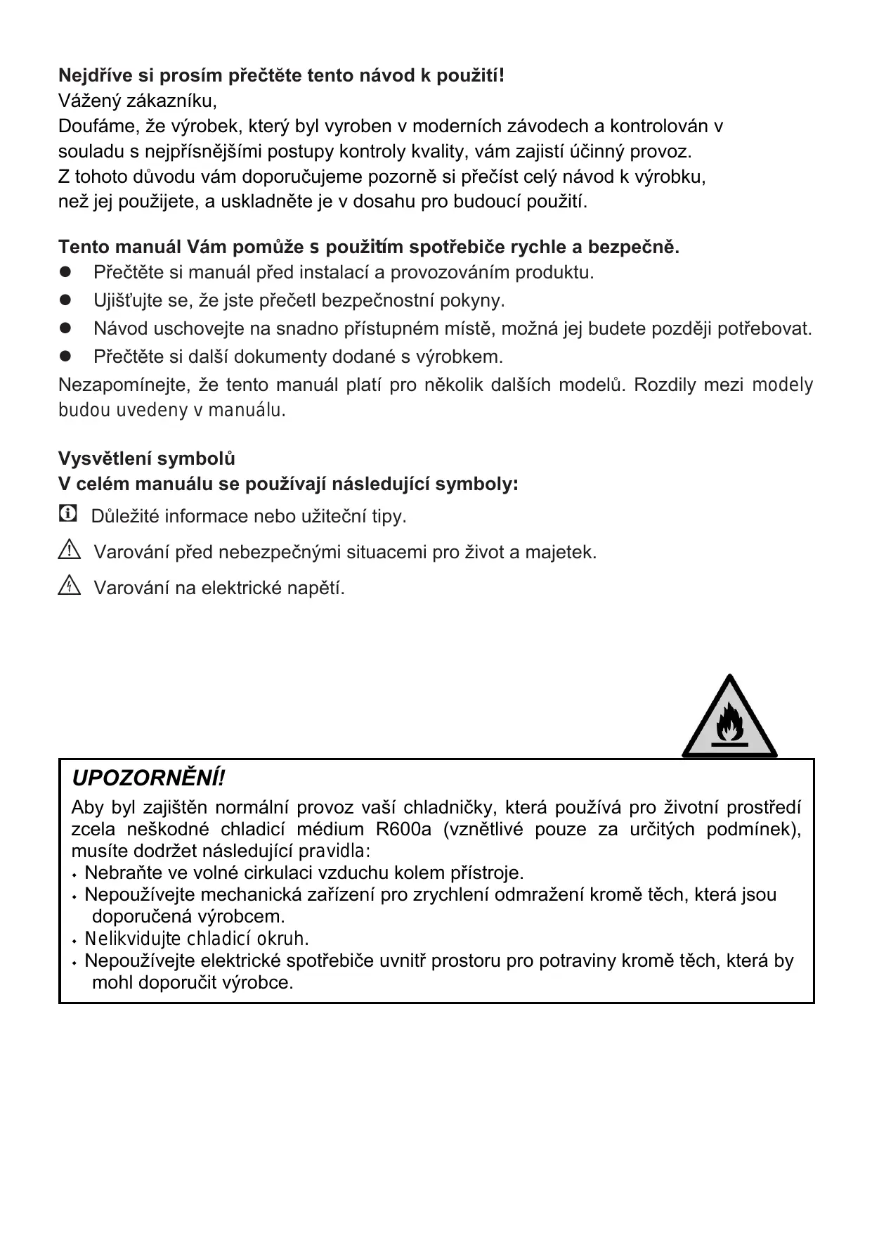 Nejdříve si prosím přečtĕte tento návod k použití! Vážený zákazníku, Doufáme, že výrobek, který byl vyroben v moderních závodech a kontrolován v souladu s nejpřísnějšími postupy kontroly kvality, vám zajistí účinný provoz. Z tohoto důvodu vám doporučujeme pozorně si přečíst celý návod k výrobku, než jej použijete, a uskladněte je v dosahu pro budoucí použití. Tento manuál Vám pomůže s použitím spotřebiče rychle a bezpečně. Přečtěte si manuál před instalací a provozováním produktu. Ujišťujte se, že jste přečetl bezpečnostní pokyny. Návod uschovejte na snadno přístupném místě, možná jej budete později potřebovat. Přečtěte si další dokumenty dodané s výrobkem. Nezapomínejte, že tento manuál platí pro několik dalších modelů. Rozdily mezi modely budou uvedeny v manuálu. Vysvětlení symbolů V celém manuálu se používají následující symboly: Důležité informace nebo užiteční tipy. Varování před nebezpečnými situacemi pro život a majetek. Varování na elektrické napětí. UPOZORNĚNÍ! Aby byl zajištěn normální provoz vaší chladničky, která používá pro životní prostředí zcela neškodné chladicí médium R600a (vznětlivé pouze za určitých podmínek), musíte dodržet následující pravidla: Nebraňte ve volné cirkulaci vzduchu kolem přístroje. Nepoužívejte mechanická zařízení pro zrychlení odmražení kromě těch, která jsou doporučená výrobcem. Nelikvidujte chladicí okruh. Nepoužívejte elektrické spotřebiče uvnitř prostoru pro potraviny kromě těch, která by mohl doporučit výrobce. OBSAH 1 Vaše chladnička