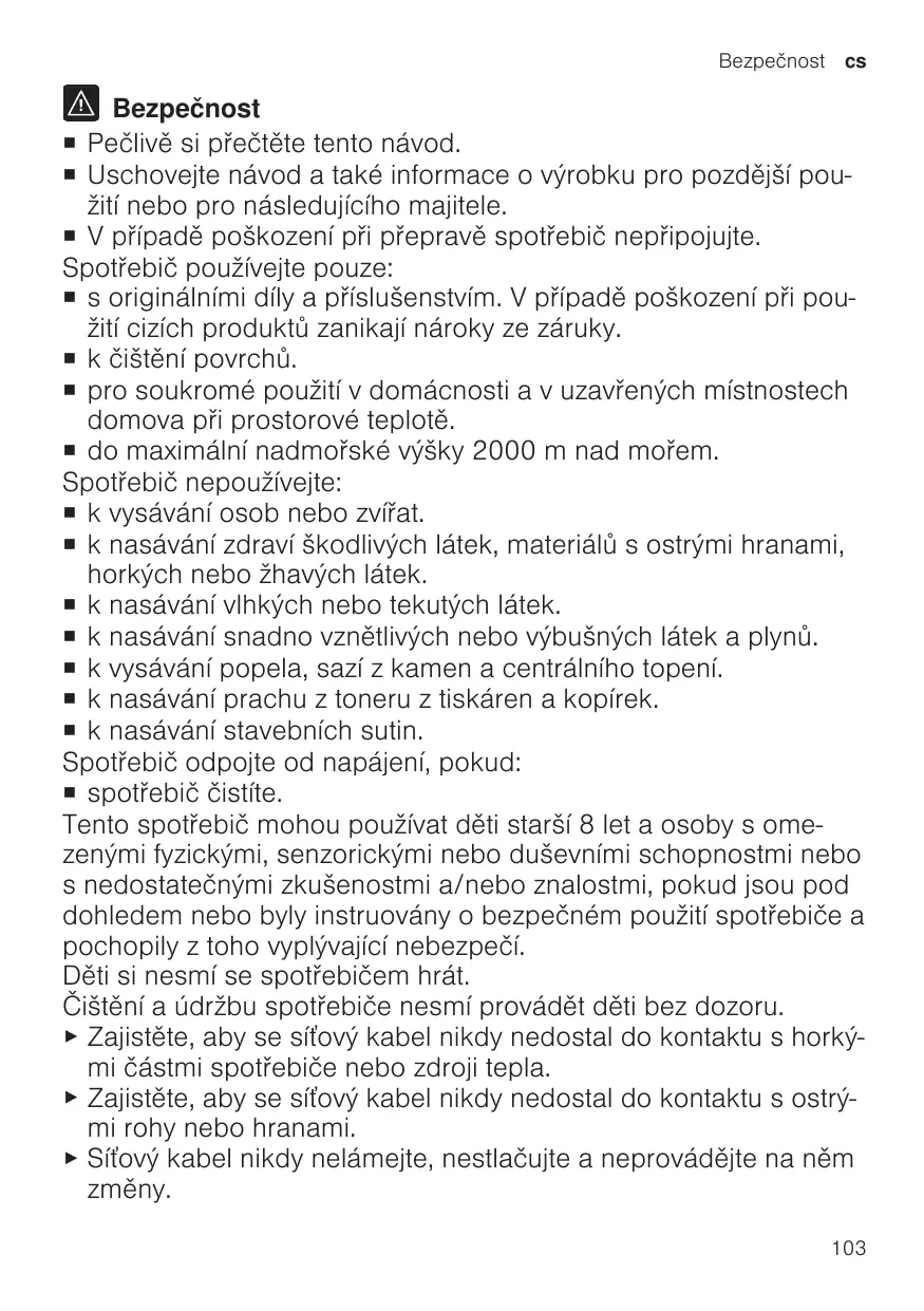 Bezpečnost ¡ Pečlivě si přečtěte tento návod. ¡ Uschovejte návod a také informace o výrobku pro pozdější použití nebo pro následujícího majitele. ¡ V případě poškození při přepravě spotřebič nepřipojujte. Spotřebič používejte pouze: ¡ s originálními díly a příslušenstvím. V případě poškození při použití cizích produktů zanikají nároky ze záruky. ¡ k čištění povrchů. ¡ pro soukromé použití v domácnosti a v uzavřených místnostech domova při prostorové teplotě. ¡ do maximální nadmořské výšky 2000 m nad mořem. Spotřebič nepoužívejte: ¡ k vysávání osob nebo zvířat. ¡ k nasávání zdraví škodlivých látek, materiálů s ostrými hranami, horkých nebo žhavých látek. ¡ k nasávání vlhkých nebo tekutých látek. ¡ k nasávání snadno vznětlivých nebo výbušných látek a plynů. ¡ k vysávání popela, sazí z kamen a centrálního topení. ¡ k nasávání prachu z toneru z tiskáren a kopírek. ¡ k nasávání stavebních sutin. Spotřebič odpojte od napájení, pokud: ¡ spotřebič čistíte. Tento spotřebič mohou používat děti starší 8 let a osoby s omezenými fyzickými, senzorickými nebo duševními schopnostmi nebo s nedostatečnými zkušenostmi a/nebo znalostmi, pokud jsou pod dohledem nebo byly instruovány o bezpečném použití spotřebiče a pochopily z toho vyplývající nebezpečí. Děti si nesmí se spotřebičem hrát. Čištění a údržbu spotřebiče nesmí provádět děti bez dozoru. ▶ Zajistěte, aby se síťový kabel nikdy nedostal do kontaktu s horkými částmi spotřebiče nebo zdroji tepla. ▶ Zajistěte, aby se síťový kabel nikdy nedostal do kontaktu s ostrými rohy nebo hranami. ▶ Síťový kabel nikdy nelámejte, nestlačujte a neprovádějte na něm změny. 103
