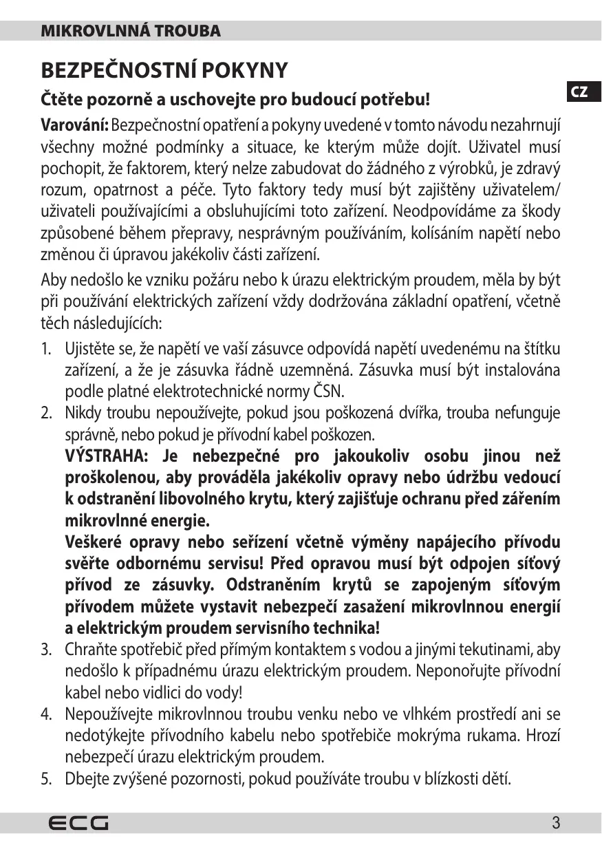správně, nebo pokud je přívodní kabel poškozen. VÝSTRAHA: Je nebezpečné pro jakoukoliv osobu jinou než proškolenou, aby prováděla jakékoliv opravy nebo údržbu vedoucí k odstranění libovolného krytu, který zajišťuje ochranu před zářením mikrovlnné energie. Veškeré opravy nebo seřízení včetně výměny napájecího přívodu svěřte odbornému servisu! Před opravou musí být odpojen síťový přívod ze zásuvky. Odstraněním krytů se zapojeným síťovým přívodem můžete vystavit nebezpečí zasažení mikrovlnnou energií a elektrickým proudem servisního technika!