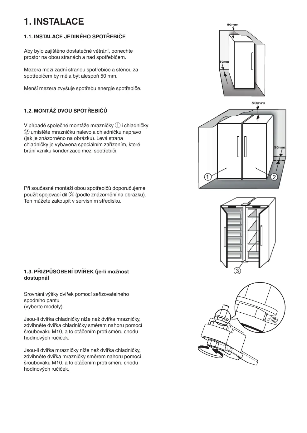 1.2. INSTALLATION DE DEUX APPAREILS Durant l'installation du congélateur 1 et du réfrigérateur 2 , assurez-vous que le congélateur est placé à gauche et le réfrigérateur à droite (comme illustré sur l'image). Sur le côté gauche du réfrigérateur se trouve un dispositif spécial permettant d'éviter les problèmes de condensation entre les appareils.