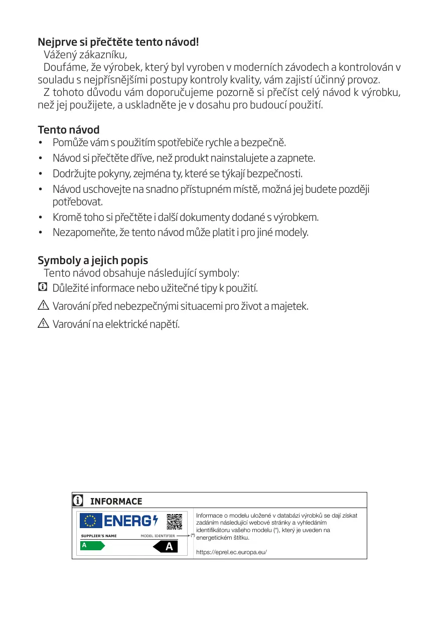 C INFORMACE SUPPLIER’S NAME A A MODEL IDENTIFIER A C Informace o modelu uložené v databázi výrobků se dají získat zadáním následující webové stránky a vyhledáním identifikátoru vašeho modelu (*), který je uveden na (*) energetickém štítku. https://eprel.ec.europa.eu/