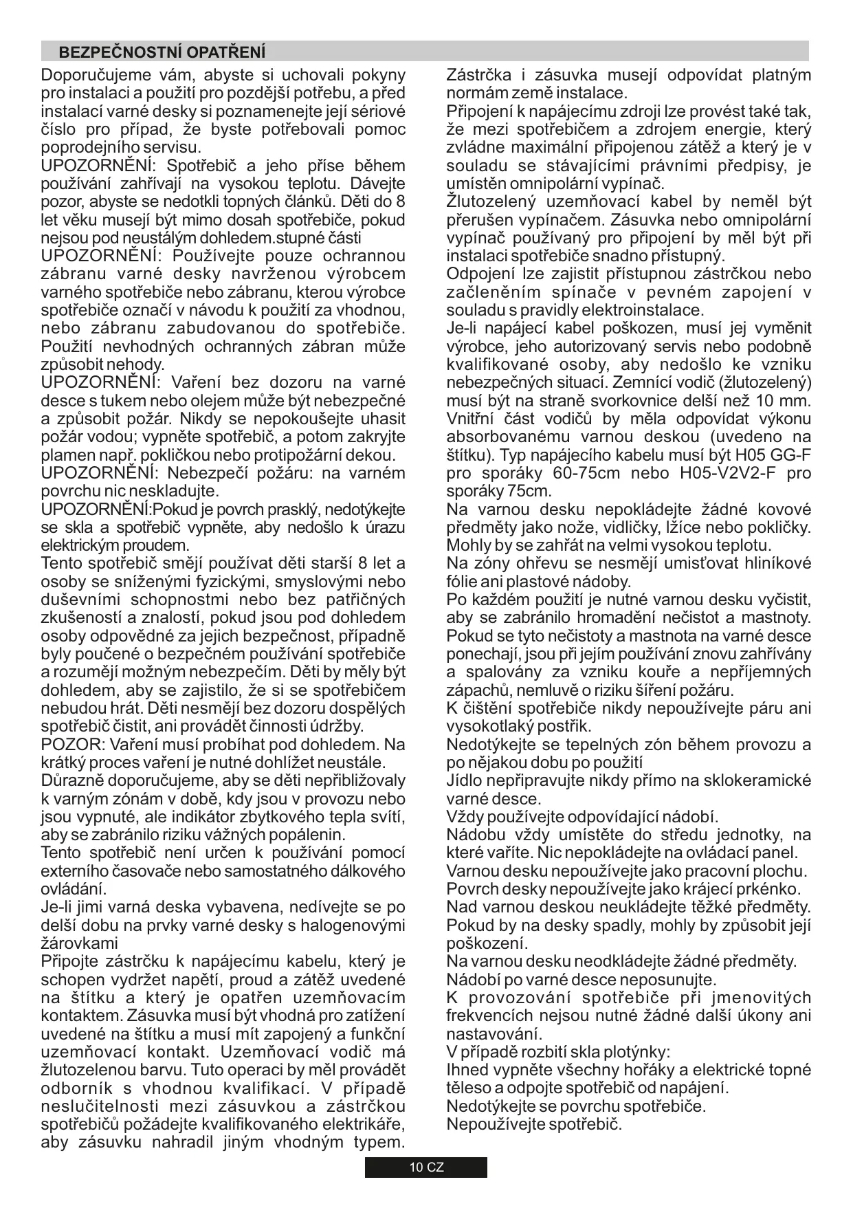 AVERTISSEMENT : l'appareil et ses parties accessibles chauffent pendant l'utilisation. Évitez de toucher les éléments chauffants. Les enfants de moins de 8 ans doivent être tenus hors de portée de l'appareil, sauf s'ils sont surveillés en permanence. AVERTISSEMENT : n'utilisez qu'un dispositif de protection de votre table de cuisson conçu par le fabricant de votre appareil ou indiqué, dans le manuel d'utilisation, comme étant compatible, ou bien le dispositif de protection fourni avec l'appareil. L'utilisation d'un dispositif de protection non approprié peut causer des accidents. AVERTISSEMENT : l'utilisation de la table de cuisson sans surveillance avec manipulation de graisse ou d'huile peut être dangereux et provoquer un incendie. N'essayez JAMAIS d'éteindre un feu avec de l'eau, mais éteignez l'appareil, puis couvrez la flamme avec un couvercle ou une couverture anti-feu, par exemple. AVERTISSEMENT, risque d'incendie : ne stockez pas d'éléments sur les surfaces de cuisson. AVERTISSEMENT : si la surface est fissurée, ne touchez pas le verre de la table et éteignez l'appareil pour éviter tout risque d'électrocution. Cet appareil peut être utilisé par des enfants âgés de 8 ans et plus, par des personnes dont les capacités physiques, sensorielles ou mentales sont réduites ou par des personnes dénuées d'expérience et de connaissances, mais qui ont été informées sur la manière d'utiliser l'appareil en toute sécurité, si elles comprennent les risques impliqués. Surveillez les enfants afin qu'ils ne jouent pas avec l'appareil. L'entretien et le nettoyage ne doivent pas être effectués par des enfants sans surveillance. ATTENTION : la cuisson demande d'être surveillée. Les cuissons de courte durée doivent être surveillées en permanence. Il est chaudement recommandé d'éloigner les enfants de la zone de cuisson lorsqu'elle fonctionne ou même quand elle est éteinte, mais que l'indicateur de chaleur résiduelle est encore visible, afin d'éviter tout risque de brûlures graves. Cet appareil n'est pas conçu pour être actionné par un temporisateur externe ou un système séparé de commande à distance. Si votre table de cuisson est dotée d'éléments halogènes, n'en fixez pas la lumière. Brancher le câble d'alimentation sur une prise de courant qui supporte le voltage (le courant et la charge sont indiqués sur l'étiquette) et vérifier la présence d'une mise à la terre. La prise d'alimentation doit supporter la charge indiquée sur l'étiquette et être dotée d'une mise à la terre en état de fonctionnement. Le câble conducteur de mise à la terre est jaune et vert. Cette opération doit être exécutée par du personnel qualifié. En cas d'incompatibilité entre la prise d'alimentation et la fiche du câble de l'appareil, demander à un électricien professionnel de remplacer la prise d'alimentation par un dispositif compatible. La fiche du câble d'alimentation et la prise d'alimentation doivent être conformes aux normes en vigueur dans le pays d'installation. 06 FR