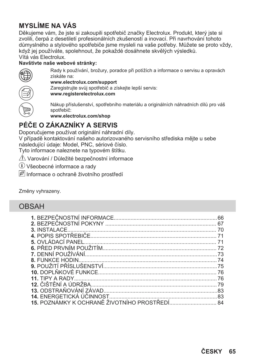 Děkujeme vám, že jste si zakoupili spotřebič značky Electrolux. Produkt, který jste si zvolili, čerpá z desetiletí profesionálních zkušeností a inovací. Při navrhování tohoto důmyslného a stylového spotřebiče jsme mysleli na vaše potřeby. Můžete se proto vždy, když jej používáte, spolehnout, že pokaždé dosáhnete skvělých výsledků. Vítá vás Electrolux. Navštivte naše webové stránky: Rady k používání, brožury, poradce při potížích a informace o servisu a opravách získáte na: www.electrolux.com/support Zaregistrujte svůj spotřebič a získejte lepší servis: www.registerelectrolux.com Nákup příslušenství, spotřebního materiálu a originálních náhradních dílů pro váš spotřebič: www.electrolux.com/shop PÉČE O ZÁKAZNÍKY A SERVIS Doporučujeme používat originální náhradní díly. V případě kontaktování našeho autorizovaného servisního střediska mějte u sebe následující údaje: Model, PNC, sériové číslo. Tyto informace naleznete na typovém štítku. Varování / Důležité bezpečnostní informace Všeobecné informace a rady Informace o ochraně životního prostředí Zmĕny vyhrazeny. OBSAH