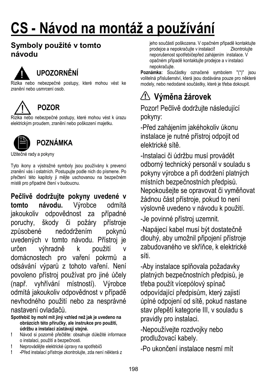 Pečlivě dodržujte pokyny uvedené v tomto návodu. Výrobce odmítá jakoukoliv odpovědnost za případné poruchy, škody či požáry přístroje způsobené nedodržením pokynů uvedených v tomto návodu. Přístroj je určen výhradně k použití v domácnostech pro vaření pokrmů a odsávání výparů z tohoto vaření. Není povoleno přístroj používat pro jiné účely (např. vyhřívání místností). Výrobce odmítá jakoukoliv odpovědnost v případě nevhodného použití nebo za nesprávné nastavení ovladačů. Spotřebič by mohl mít jiný vzhled než jak je uvedeno na obrázcích této příručky, ale instrukce pro použití, údržbu a instalaci zůstávají stejné. ! Návod si pozorně přečtěte: obsahuje důležité informace o instalaci, použití a bezpečnosti. ! Neprovádějte elektrické úpravy na spotřebiči ! -Před instalací přístroje zkontrolujte, zda není některá z
