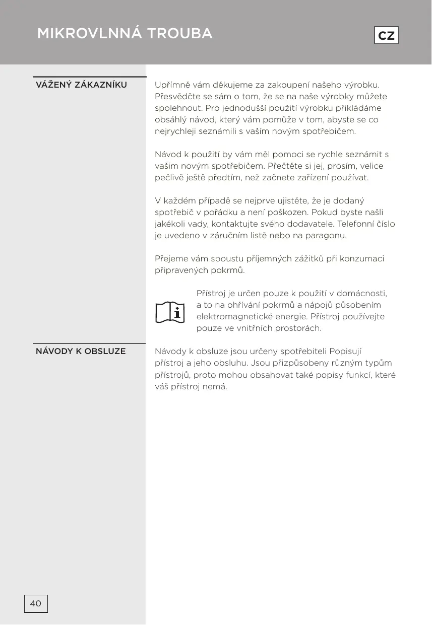 Upřímně vám děkujeme za zakoupení našeho výrobku. Přesvědčte se sám o tom, že se na naše výrobky můžete spolehnout. Pro jednodušší použití výrobku přikládáme obsáhlý návod, který vám pomůže v tom, abyste se co nejrychleji seznámili s vaším novým spotřebičem. Návod k použití by vám měl pomoci se rychle seznámit s vašim novým spotřebičem. Přečtěte si jej, prosím, velice pečlivě ještě předtím, než začnete zařízení používat. V každém případě se nejprve ujistěte, že je dodaný spotřebič v pořádku a není poškozen. Pokud byste našli jakékoli vady, kontaktujte svého dodavatele. Telefonní číslo je uvedeno v záručním listě nebo na paragonu. Přejeme vám spoustu příjemných zážitků při konzumaci připravených pokrmů. Přístroj je určen pouze k použití v domácnosti, a to na ohřívání pokrmů a nápojů působením elektromagnetické energie. Přístroj používejte pouze ve vnitřních prostorách.