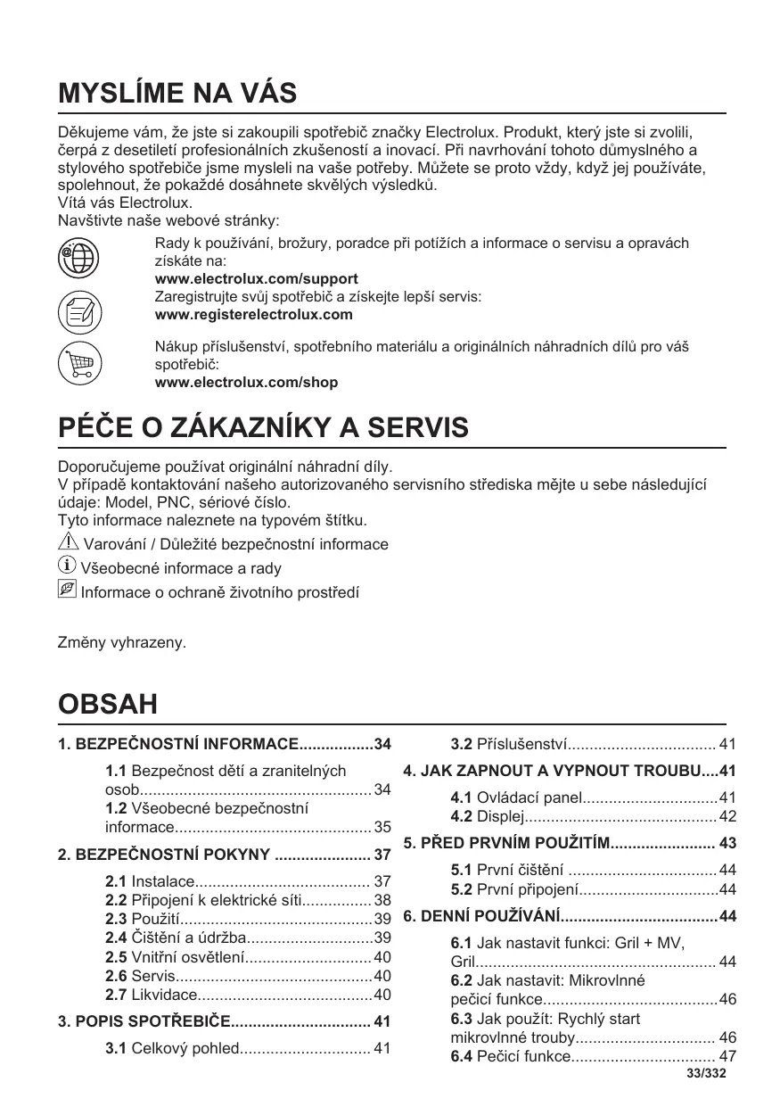 Děkujeme vám, že jste si zakoupili spotřebič značky Electrolux. Produkt, který jste si zvolili, čerpá z desetiletí profesionálních zkušeností a inovací. Při navrhování tohoto důmyslného a stylového spotřebiče jsme mysleli na vaše potřeby. Můžete se proto vždy, když jej používáte, spolehnout, že pokaždé dosáhnete skvělých výsledků. Vítá vás Electrolux. Navštivte naše webové stránky: Rady k používání, brožury, poradce při potížích a informace o servisu a opravách získáte na: www.electrolux.com/support Zaregistrujte svůj spotřebič a získejte lepší servis: www.registerelectrolux.com Nákup příslušenství, spotřebního materiálu a originálních náhradních dílů pro váš spotřebič: www.electrolux.com/shop PÉČE O ZÁKAZNÍKY A SERVIS Doporučujeme používat originální náhradní díly. V případě kontaktování našeho autorizovaného servisního střediska mějte u sebe následující údaje: Model, PNC, sériové číslo. Tyto informace naleznete na typovém štítku. Varování / Důležité bezpečnostní informace Všeobecné informace a rady Informace o ochraně životního prostředí Zmĕny vyhrazeny. OBSAH