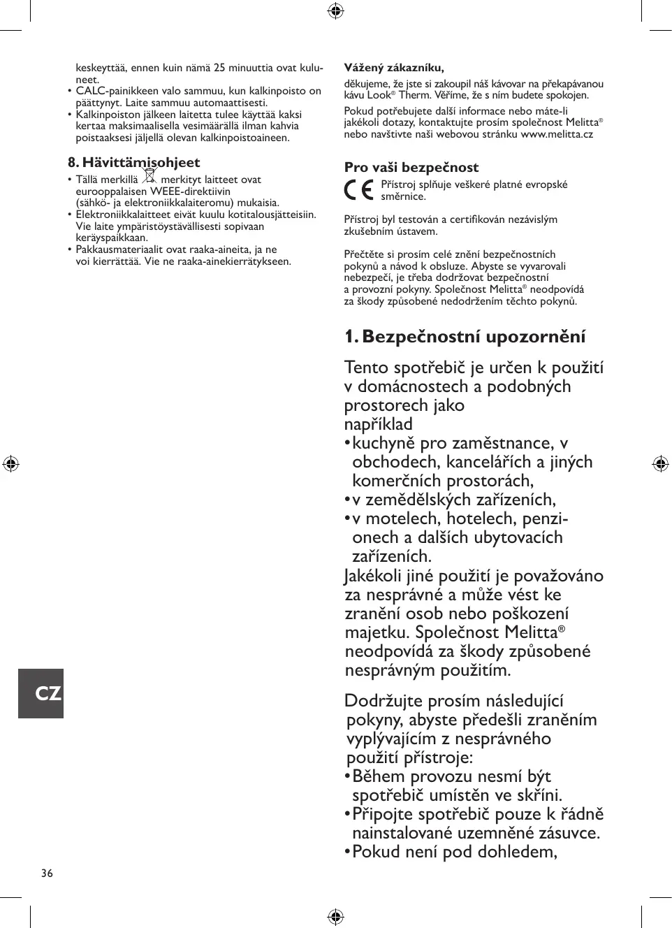 L‘appareil est conforme aux normes européennes en vigueur. L‘appareil a été contrôlé et certifié par des instituts de tests indépendants. Veuillez lire les consignes de sécurité et le mode d‘emploi dans leur intégralité. Afin d‘éviter tout danger, respectez les consignes de sécurité ainsi que le mode d‘emploi. Melitta® décline toute responsabilité en cas de dommages résultant d‘un non-respect des consignes.