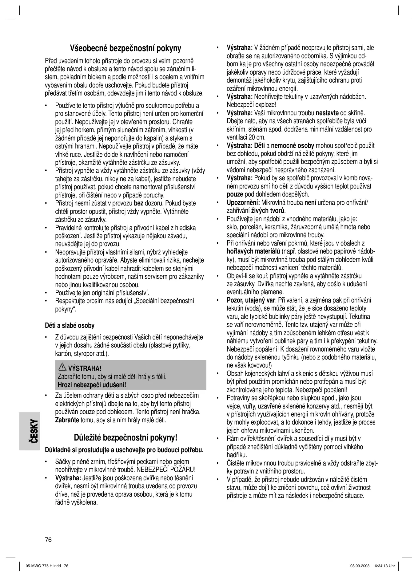 Výstraha: V žádném případě neopravujte přístroj sami, ale obraťte se na autorizovaného odborníka. S výjimkou odborníka je pro všechny ostatní osoby nebezpečné provádět jakékoliv opravy nebo údržbové práce, které vyžadují demontáž jakéhokoliv krytu, zajišťujícího ochranu proti ozáření mikrovlnnou energií. Výstraha: Neohřívejte tekutiny v uzavřených nádobách. Nebezpečí exploze! Výstraha: Vaši mikrovlnnou troubu nestavte do skříně. Dbejte nato, aby na všech stranách spotřebiče byla vůči skříním, stěnám apod. dodržena minimální vzdálenost pro ventilaci 20 cm. Výstraha: Děti a nemocné osoby mohou spotřebič použít bez dohledu, pokud obdrží náležité pokyny, které jim umožní, aby spotřebič použili bezpečným způsobem a byli si vědomi nebezpečí nesprávného zacházení. Výstraha: Pokud by se spotřebič provozoval v kombinovaném provozu smí ho děti z důvodu vyšších teplot používat pouze pod dohledem dospělých. Upozornění: Mikrovlná trouba není určena pro ohřívání/ zahřívání živých tvorů. Používejte jen nádobí z vhodného materiálu, jako je: sklo, porcelán, keramika, žáruvzdorná umělá hmota nebo speciální nádobí pro mikrovlnné trouby. Při ohřívání nebo vaření pokrmů, které jsou v obalech z hořlavých materiálů (např. plastové nebo papírové nádobky), musí být mikrovlnná trouba pod stálým dohledem kvůli nebezpečí možnosti vznícení těchto materiálů. Objeví-li se kouř, přístroj vypněte a vytáhněte zástrčku ze zásuvky. Dvířka nechte zavřená, aby došlo k udušení eventuálního plamene. Pozor, utajený var: Při vaření, a zejména pak při ohřívání tekutin (voda), se může stát, že je sice dosaženo teploty varu, ale typické bublinky páry ještě nevystupují. Tekutina se vaří nerovnoměrně. Tento tzv. utajený var může při vyjímání nádoby a tím způsobeném lehkém otřesu vést k náhlému vytvoření bublinek páry a tím i k překypění tekutiny. Nebezpečí popálení! K dosažení rovnoměrného varu vložte do nádoby skleněnou tyčinku (nebo z podobného materiálu, ne však kovovou!) Obsah kojeneckých lahví a sklenic s dětskou výživou musí být před použitím promíchán nebo protřepán a musí být zkontrolována jeho teplota. Nebezpečí popálení! Potraviny se skořápkou nebo slupkou apod., jako jsou vejce, vuřty, uzavřené skleněné konzervy atd., nesmějí být v přístrojích využívajících energii mikrovln ohřívány, protože by mohly explodovat, a to dokonce i tehdy, jestliže je proces jejich ohřevu mikrovlnami ukončen. Rám dvířek/těsnění dvířek a sousedící díly musí být v případě znečištění důkladně vyčištěny pomocí vlhkého hadříku. Čistěte mikrovlnnou troubu pravidelně a vždy odstraňte zbytky potravin z vnitřního prostoru. V případě, že přístroj nebude udržován v náležitě čistém stavu, může dojít ke zničení povrchu, což ovlivní životnost přístroje a může mít za následek i nebezpečné situace.