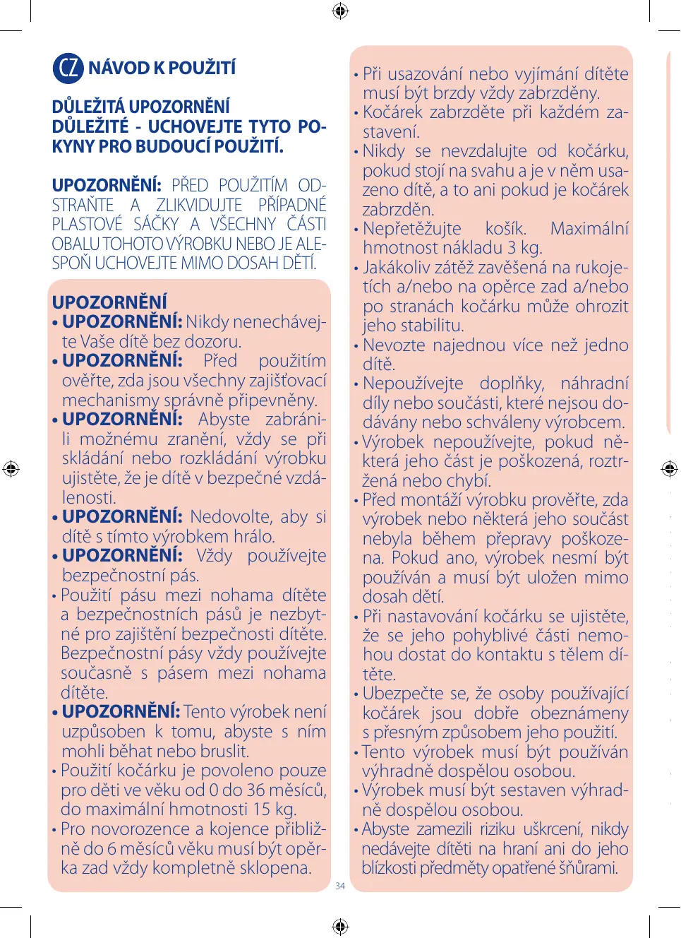 •AVERTISSEMENT : Pour éviter toute blessure, maintenir votre enfant à l’écart lors du dépliage et du pliage du produit. •AVERTISSEMENT : Ne pas laisser votre enfant jouer avec ce produit. • AVERTISSEMENT : Toujours utiliser le système de retenue. • L’utilisation de l’entrejambe et du harnais de sécurité est indispensable pour garantir la sécurité de l’enfant. Ne jamais utiliser l’entrejambe sans le harnais de sécurité. •A VERTISSEMENT : Ce produit ne convient pas pour faire du jogging ou des promenades en rollers. • L’utilisation de la poussette est autorisée pour des enfants d’un âge compris entre 0 et 36 mois, jusqu’à un poids maximum de 15 kg. • De la naissance de l’enfant à ses 6 mois environ, le dossier doit être 14