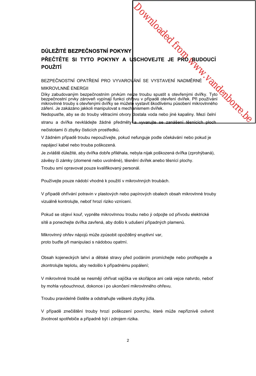VAROVÁNÍ: Jakékoli servisní nebo jiné zásahy, v rámci nichž je nutno sejmout kryt chránící pĜed mikrovlnným záĜením, smí provádČt pouze oprávnČná osoba. VAROVÁNÍ: Tekutiny a jiné potraviny neohĜívejte v uzavĜených nádobách, mĤže dojít k jejich výbuchu.