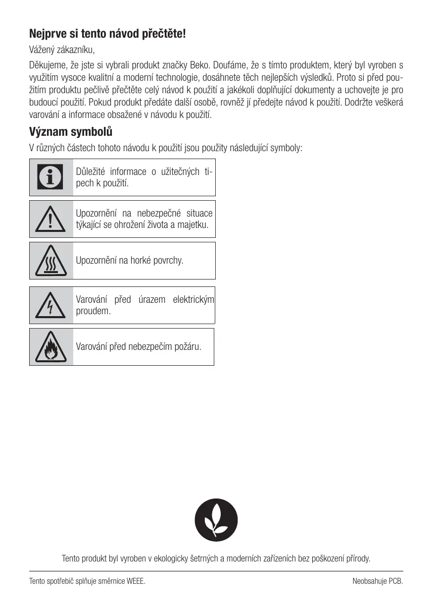 Nejprve si tento návod přečtěte! Vážený zákazníku, Děkujeme, že jste si vybrali produkt značky Beko. Doufáme, že s tímto produktem, který byl vyroben s využitím vysoce kvalitní a moderní technologie, dosáhnete těch nejlepších výsledků. Proto si před použitím produktu pečlivě přečtěte celý návod k použití a jakékoli doplňující dokumenty a uchovejte je pro budoucí použití. Pokud produkt předáte další osobě, rovněž jí předejte návod k použití. Dodržte veškerá varování a informace obsažené v návodu k použití.