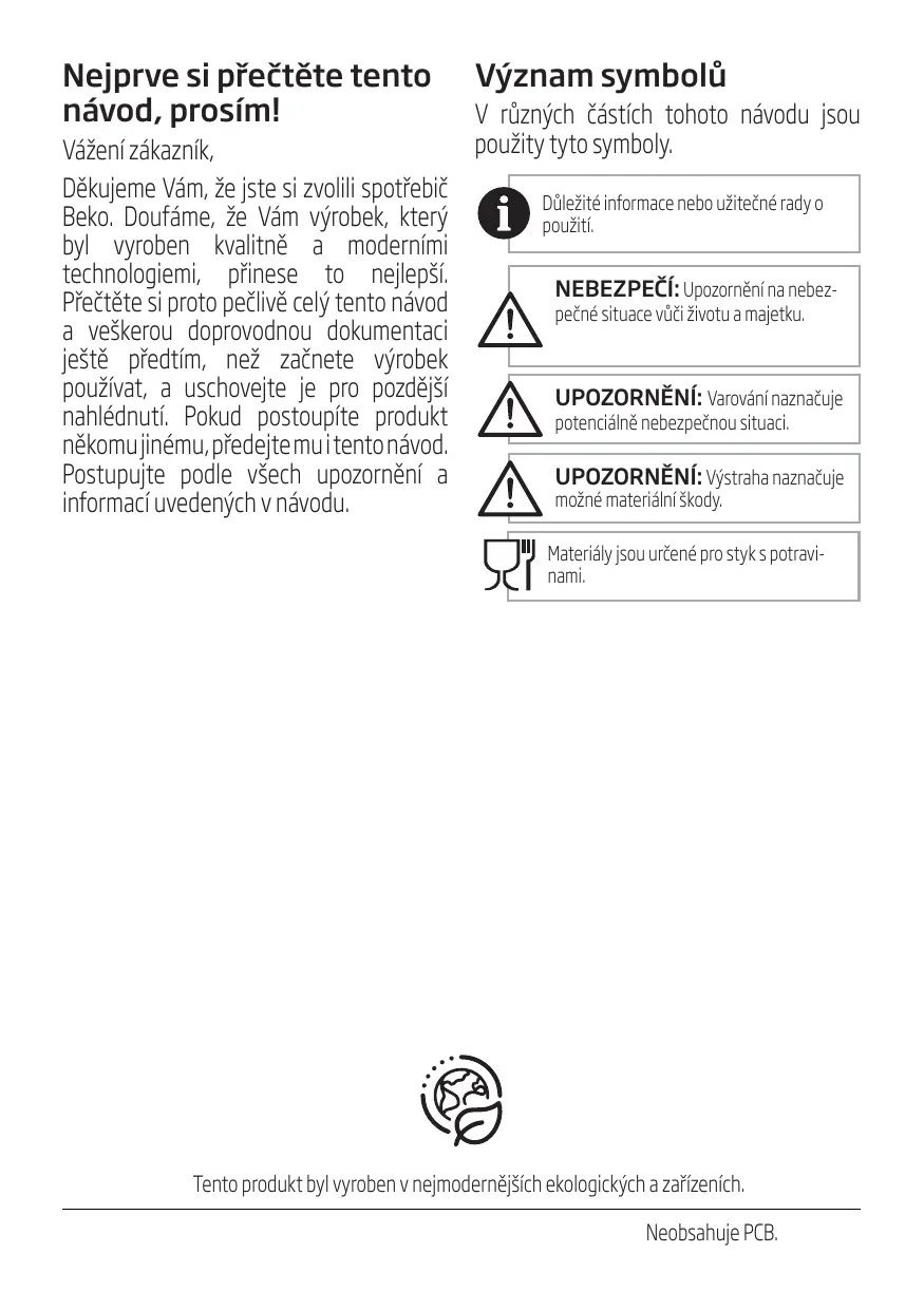 Nejprve si přečtěte tento návod, prosím! Vážení zákazník, Děkujeme Vám, že jste si zvolili spotřebič Beko. Doufáme, že Vám výrobek, který byl vyroben kvalitně a moderními technologiemi, přinese to nejlepší. Přečtěte si proto pečlivě celý tento návod a veškerou doprovodnou dokumentaci ještě předtím, než začnete výrobek používat, a uschovejte je pro pozdější nahlédnutí. Pokud postoupíte produkt někomu jinému, předejte mu i tento návod. Postupujte podle všech upozornění a informací uvedených v návodu.