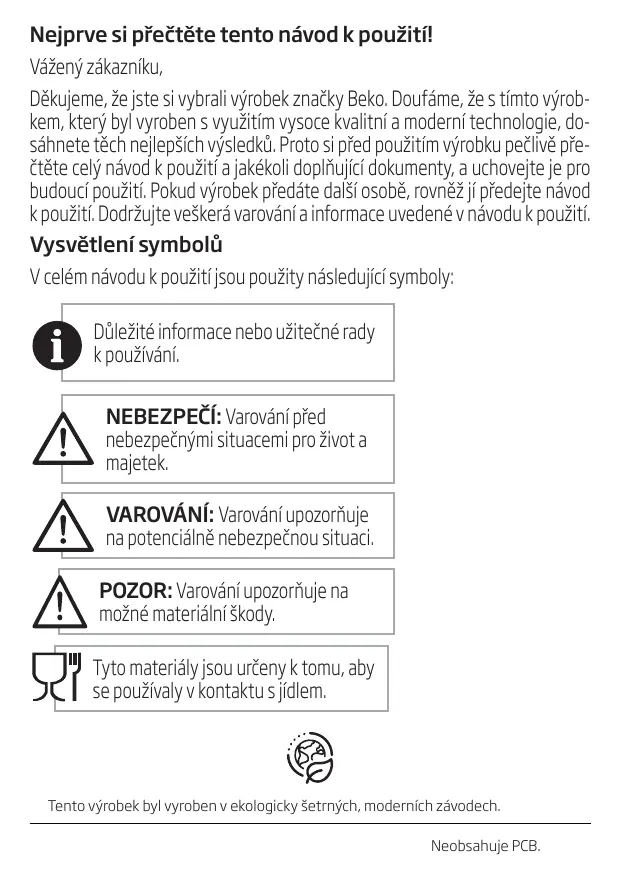 Nejprve si přečtěte tento návod k použití! Vážený zákazníku, Děkujeme, že jste si vybrali výrobek značky Beko. Doufáme, že s tímto výrobkem, který byl vyroben s využitím vysoce kvalitní a moderní technologie, dosáhnete těch nejlepších výsledků. Proto si před použitím výrobku pečlivě přečtěte celý návod k použití a jakékoli doplňující dokumenty, a uchovejte je pro budoucí použití. Pokud výrobek předáte další osobě, rovněž jí předejte návod k použití. Dodržujte veškerá varování a informace uvedené v návodu k použití. Vysvětlení symbolů V celém návodu k použití jsou použity následující symboly: Důležité informace nebo užitečné rady k používání. NEBEZPEČÍ: Varování před nebezpečnými situacemi pro život a majetek. VAROVÁNÍ: Varování upozorňuje na potenciálně nebezpečnou situaci. POZOR: Varování upozorňuje na možné materiální škody. Tyto materiály jsou určeny k tomu, aby se používaly v kontaktu s jídlem.