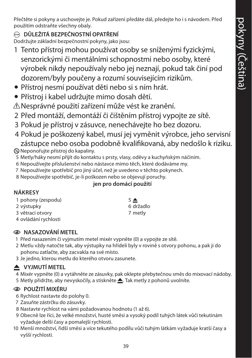 11 Metly používejte ke šlehání/kypření těsta, šlehání bílků a krému. 12 Pokud chcete mixér odložit, vypněte ho (0) a směs z metel otřepte. 13 Přístroj nepoužívejte nepřetržitě déle než 3 minut. Po 3 minutách provozu nechte přístroj 5 minut odpočinout, než budete pokračovat. 14 Když motor začne jít ztuha, přidejte do směsi více tekutiny, pokud je to možné, a nebo přístroj vypněte a pokračujte ručně. 15 Rychlost nastavte do polohy 0 a přístroj vypněte.