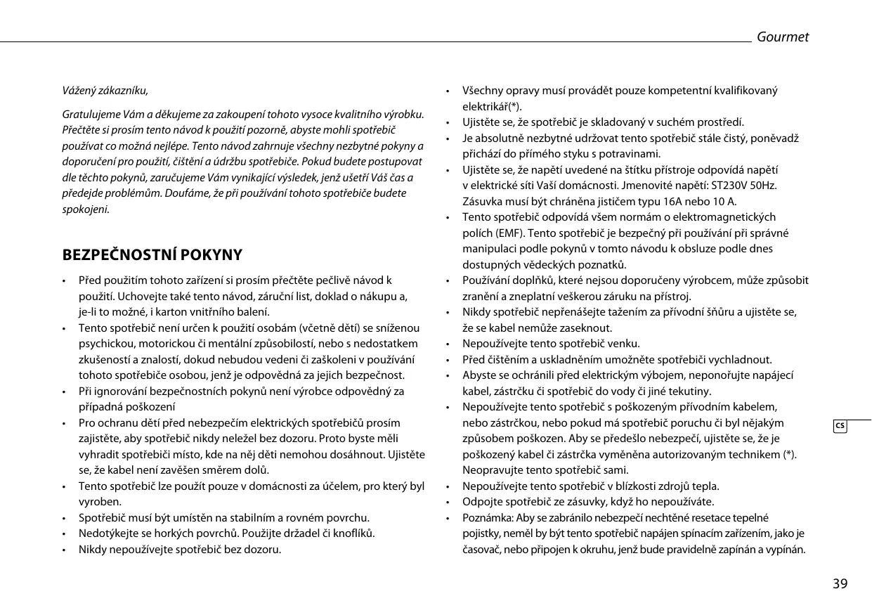 Il faut impérativement que cet appareil demeure propre car il est en contact direct avec des aliments. Vérifiez si la tension de l'appareil correspond à la tension du secteur de votre domicile. Tension nominale : 230V CA 50Hz. La prise doit être d’au moins 16A ou 10A et à fusible lent. Cet appareil est conforme à toutes les normes relatives aux champs électromagnétiques (CEM). D’après les preuves scientifiques disponibles à ce jour, cet appareil est sans danger à l’utilisation, à condition qu’il soit utilisé de manière correcte et en respectant les consignes de cette notice d’emploi. L’utilisation d’accessoires qui ne sont pas recommandés par le fabricant peut entrainer des blessures et annulera toutes garanties en votre possession. Ne jamais déplacer l’appareil en tirant sur le cordon et veillez à ce que ce dernier ne devienne pas entortillé. Ne pas utiliser cet appareil à l’extérieur. Laissez refroidir l’appareil avant de le nettoyer ou de le ranger. Ne pas immerger le cordon, la prise ou l'appareil dans de l'eau ou autre liquide afin de vous éviter un choc électrique. Ne pas utiliser cet appareil avec un cordon ou une prise endommagés ou s’il ne fonctionne pas correctement, ou a subi des dégâts quelconques. Afin d’éviter tous dangers, veillez à ce qu’un cordon ou prise endommagés soient remplacés par un technicien agréé (*). Ne réparez pas vous-même cet appareil. Ne pas utiliser cet appareil à proximité de sources de chaleur directe. Débranchez l’appareil de la prise lorsqu’il n’est pas utilisé.