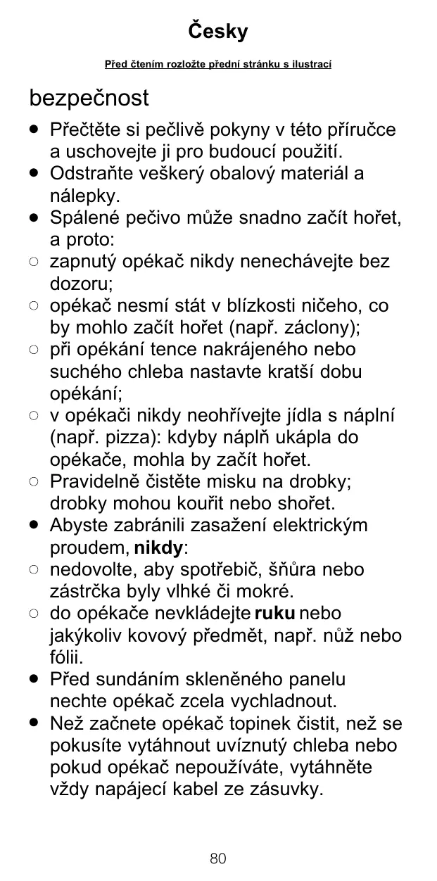 Přečtěte si pečlivě pokyny v této příručce a uschovejte ji pro budoucí použití. Odstraňte veškerý obalový materiál a nálepky. Spálené peïivo mº¥e snadno zaïít ho¡et, a proto: zapnutƒ opékaï nikdy nenechávejte bez dozoru; opékaï nesmí stát v blízkosti niïeho, co by mohlo zaïít ho¡et (nap¡. záclony); p¡i opékání tence nakrájeného nebo suchého chleba nastavte krat•í dobu opékání; v opékaïi nikdy neoh¡ívejte jídla s náplní (nap¡. pizza): kdyby náplñ ukápla do opékaïe, mohla by zaïít ho¡et. Pravidelně čistěte misku na drobky; drobky mohou kouřit nebo shořet. Abyste zabránili zasažení elektrickým proudem, nikdy: nedovolte, aby spot¡ebič, šňºra nebo zástrčka byly vlhké či mokré. do opékače nevkládejte ruku nebo jakýkoliv kovový předmět, např. nůž nebo fólii. Před sundáním skleněného panelu nechte opékač zcela vychladnout. Ne¥ zaïnete opékaï topinek ïistit, ne¥ se pokusíte vytáhnout uvíznutƒ chleba nebo pokud opékaï nepou¥íváte, vytáhnête v¥dy napájecí kabel ze zásuvky.