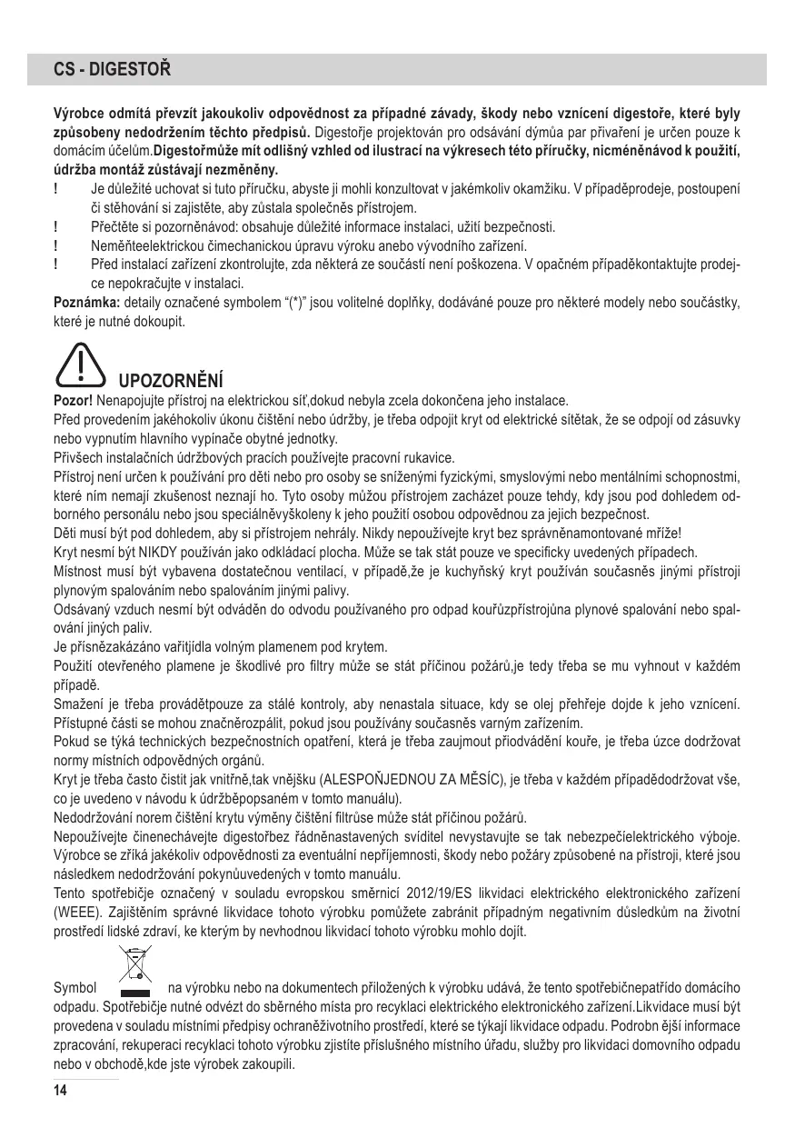 Pozor! Nenapojujte přístroj na elektrickou síť,dokud nebyla zcela dokončena jeho instalace. Před provedením jakéhokoliv úkonu čištění nebo údržby, je třeba odpojit kryt od elektrické sítětak, že se odpojí od zásuvky nebo vypnutím hlavního vypínače obytné jednotky. Přivšech instalačních údržbových pracích používejte pracovní rukavice. Přístroj není určen k používání pro děti nebo pro osoby se sníženými fyzickými, smyslovými nebo mentálními schopnostmi, které ním nemají zkušenost neznají ho. Tyto osoby můžou přístrojem zacházet pouze tehdy, kdy jsou pod dohledem odborného personálu nebo jsou speciálněvyškoleny k jeho použití osobou odpovědnou za jejich bezpečnost. Děti musí být pod dohledem, aby si přístrojem nehrály. Nikdy nepoužívejte kryt bez správněnamontované mříže! Kryt nesmí být NIKDY používán jako odkládací plocha. Může se tak stát pouze ve specificky uvedených případech. Místnost musí být vybavena dostatečnou ventilací, v případě,že je kuchyňský kryt používán současněs jinými přístroji plynovým spalováním nebo spalováním jinými palivy. Odsávaný vzduch nesmí být odváděn do odvodu používaného pro odpad kouřůzpřístrojůna plynové spalování nebo spalování jiných paliv. Je přísnězakázáno vařitjídla volným plamenem pod krytem. Použití otevřeného plamene je škodlivé pro filtry může se stát příčinou požárů,je tedy třeba se mu vyhnout v každém případě. Smažení je třeba provádětpouze za stálé kontroly, aby nenastala situace, kdy se olej přehřeje dojde k jeho vznícení. Přístupné části se mohou značněrozpálit, pokud jsou používány současněs varným zařízením. Pokud se týká technických bezpečnostních opatření, která je třeba zaujmout přiodvádění kouře, je třeba úzce dodržovat normy místních odpovědných orgánů. Kryt je třeba často čistit jak vnitřně,tak vnějšku (ALESPOŇJEDNOU ZA MĚSÍC), je třeba v každém případědodržovat vše, co je uvedeno v návodu k údržběpopsaném v tomto manuálu). Nedodržování norem čištění krytu výměny čištění filtrůse může stát příčinou požárů. Nepoužívejte činenechávejte digestořbez řádněnastavených svíditel nevystavujte se tak nebezpečíelektrického výboje. Výrobce se zříká jakékoliv odpovědnosti za eventuální nepříjemnosti, škody nebo požáry způsobené na přístroji, které jsou následkem nedodržování pokynůuvedených v tomto manuálu. Tento spotřebičje označený v souladu evropskou směrnicí 2012/19/ES likvidaci elektrického elektronického zařízení (WEEE). Zajištěním správné likvidace tohoto výrobku pomůžete zabránit případným negativním důsledkům na životní prostředí lidské zdraví, ke kterým by nevhodnou likvidací tohoto výrobku mohlo dojít. Symbol na výrobku nebo na dokumentech přiložených k výrobku udává, že tento spotřebičnepatřído domácího odpadu. Spotřebičje nutné odvézt do sběrného místa pro recyklaci elektrického elektronického zařízení.Likvidace musí být provedena v souladu místními předpisy ochraněživotního prostředí, které se týkají likvidace odpadu. Podrobn ější informace zpracování, rekuperaci recyklaci tohoto výrobku zjistíte příslušného místního úřadu, služby pro likvidaci domovního odpadu nebo v obchodě,kde jste výrobek zakoupili. 14