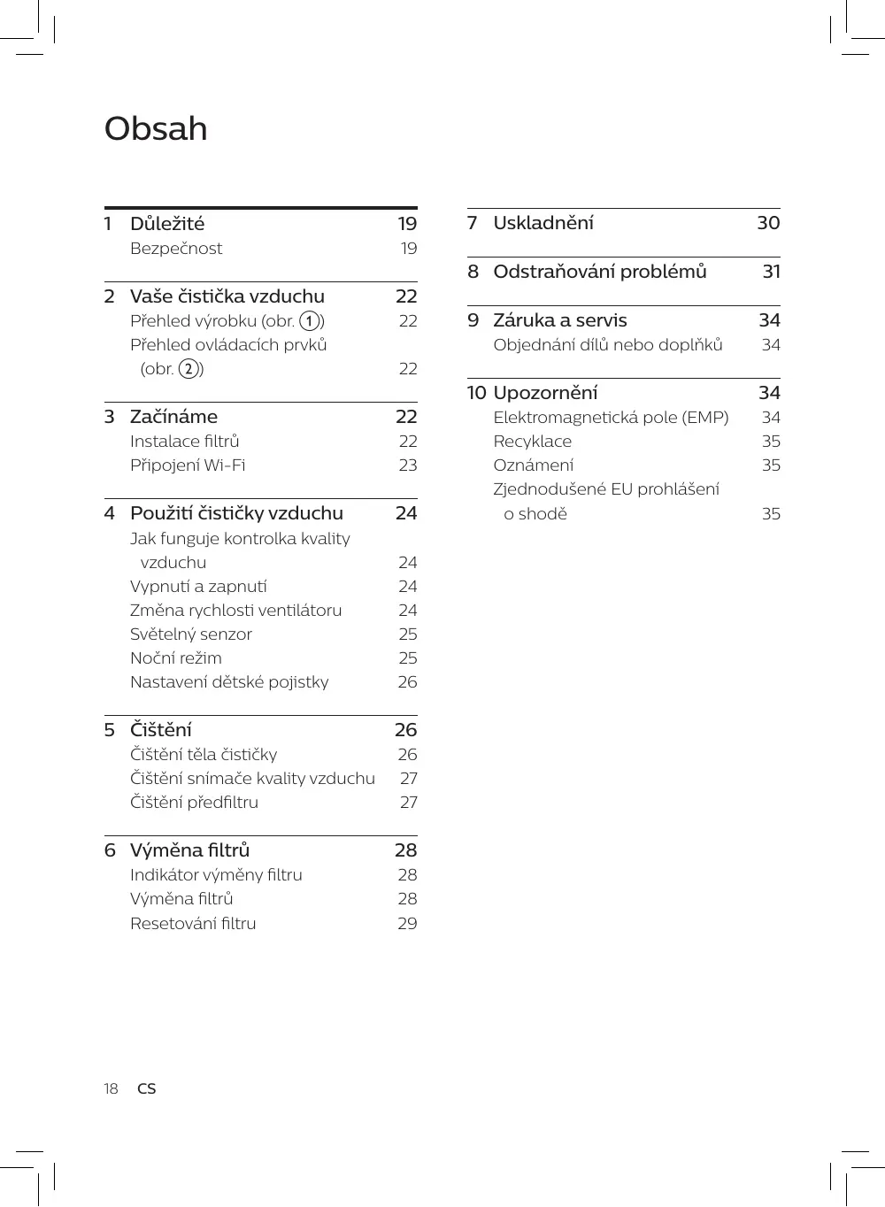 ke kondenzaci uvnitř přístroje. Aby nedocházelo k rušení, umístěte přístroj nejméně 2 metry od elektrických zařízení využívajících vzdušných rádiových vln, např. televizorů, rádií a rádiem řízených hodin. Přístroj je určen pouze pro domácí použití za běžných provozních podmínek. Nepoužívejte přístroj ve vlhkém prostředí nebo v prostředí s vysokými okolními teplotami, například v koupelně, na záchodě nebo v kuchyni. Přístroj neodstraňuje oxid uhelnatý (CO) ani radon (Rn). Není možné jej použít jako bezpečnostní zařízení v případě nehod se spalovacími procesy a nebezpečnými chemikáliemi. Pokud potřebujete přístroj přemístit, nejprve ho odpojte od napájení. Nepohybujte přístrojem tažením za napájecí kabel.