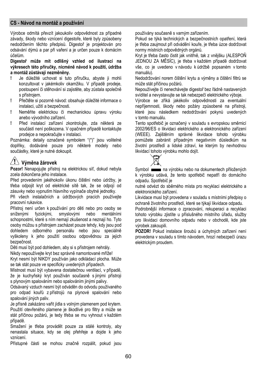 éviter à tout prix. La friture d’aliments doit être réalisée sous contrôle pour éviter que l’huile surchauffée ne prenne feu. Les pièces accessibles peuvent se réchauffer de façon importante quand elles sont utilisées avec des appareils pour la cuisson. En ce qui concerne les mesures techniques et de sécurité à adopter pour l’évacuation des fumées, s’en tenir strictement à ce qui est prévu dans les règlements des autorités locales compétentes. La hotte doit être régulièrement nettoyée, aussi bien à l’intérieur qu’à l’extérieur (AU MOINS UNE FOIS PAR MOIS, respecter néanmoins les instructions relatives à l’entretien fournies dans ce manuel). La non observation de ces normes de nettoyage de la hotte et du changement et nettoyage des filtres comporte des risques d’incendie. Ne pas utiliser ou laisser la hotte sans que les ampoules soient correctement placées pour éviter tout risque de choc électrique. La société décline toute responsabilité pour d’éventuels inconvénients, dégâts ou incendies provoqués par l’appareil et dérivés de la non observation des instructions reprises dans ce manuel. Cet appareil porte le symbole du recyclage conformément à la Directive Européenne 2002/96/CE concernant les Déchets d’Équipements Électriques et Électroniques (DEEE ou WEEE). En procédant correctement à la mise au rebut de cet appareil, vous contribuerez à empêcher toute conséquence nuisible pour l’environnement et la santé de l’homme.