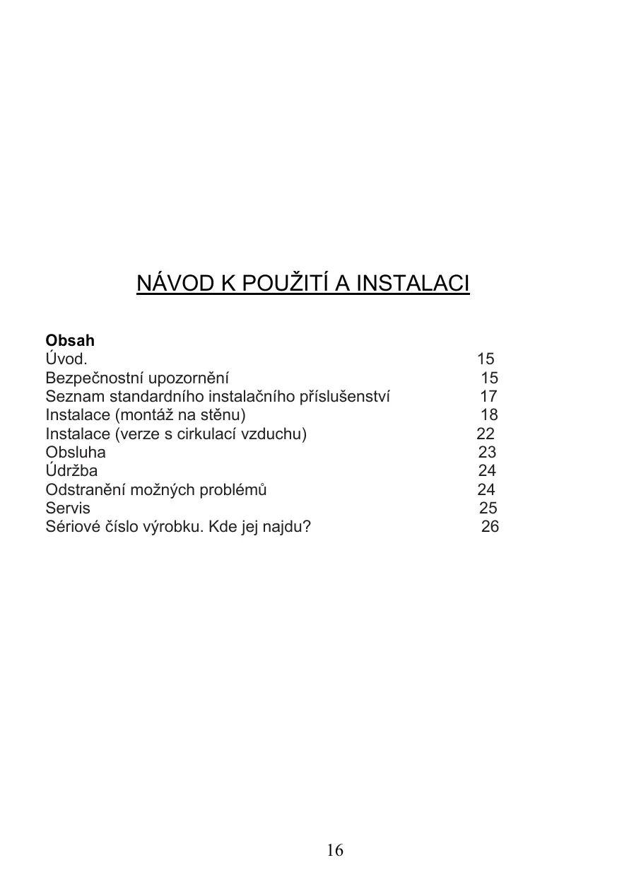 NÁVOD K POUŽITÍ A INSTALACI Obsah Úvod. Bezpečnostní upozornění Seznam standardního instalačního příslušenství Instalace (montáž na stěnu) Instalace (verze s cirkulací vzduchu) Obsluha Údržba Odstranění možných problémů Servis Sériové číslo výrobku. Kde jej najdu?