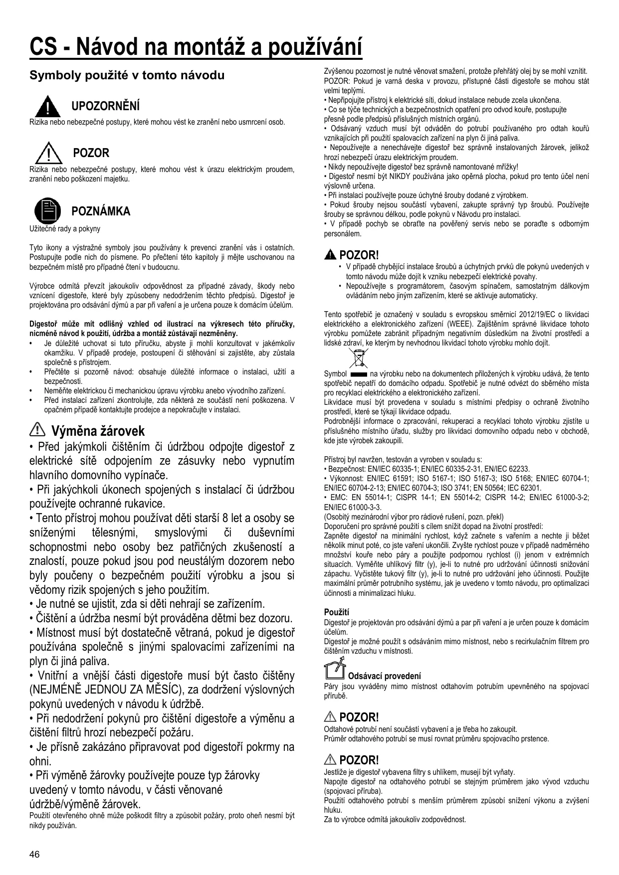 Symbol na výrobku nebo na dokumentech přiložených k výrobku udává, že tento spotřebič nepatří do domácího odpadu. Spotřebič je nutné odvézt do sběrného místa pro recyklaci elektrického a elektronického zařízení. Likvidace musí být provedena v souladu s místními předpisy o ochraně životního prostředí, které se týkají likvidace odpadu. Podrobnější informace o zpracování, rekuperaci a recyklaci tohoto výrobku zjistíte u příslušného místního úřadu, služby pro likvidaci domovního odpadu nebo v obchodě, kde jste výrobek zakoupili. Přístroj byl navržen, testován a vyroben v souladu s: • Bezpečnost: EN/IEC 60335-1; EN/IEC 60335-2-31, EN/IEC 62233. • Výkonnost: EN/IEC 61591; ISO 5167-1; ISO 5167-3; ISO 5168; EN/IEC 60704-1; EN/IEC 60704-2-13; EN/IEC 60704-3; ISO 3741; EN 50564; IEC 62301. • EMC: EN 55014-1; CISPR 14-1; EN 55014-2; CISPR 14-2; EN/IEC 61000-3-2; EN/IEC 61000-3-3. (Osobitý mezinárodní výbor pro rádiové rušení, pozn. překl) Doporučení pro správné použití s cílem snížit dopad na životní prostředí: Zapněte digestoř na minimální rychlost, když začnete s vařením a nechte ji běžet několik minut poté, co jste vaření ukončili. Zvyšte rychlost pouze v případě nadměrného množství kouře nebo páry a použijte podpornou rychlost (i) jenom v extrémních situacích. Vyměňte uhlíkový filtr (y), je-li to nutné pro udržování účinnosti snižování zápachu. Vyčistěte tukový filtr (y), je-li to nutné pro udržování jeho účinnosti. Použijte maximální průměr potrubního systému, jak je uvedeno v tomto návodu, pro optimalizaci účinnosti a minimalizaci hluku.