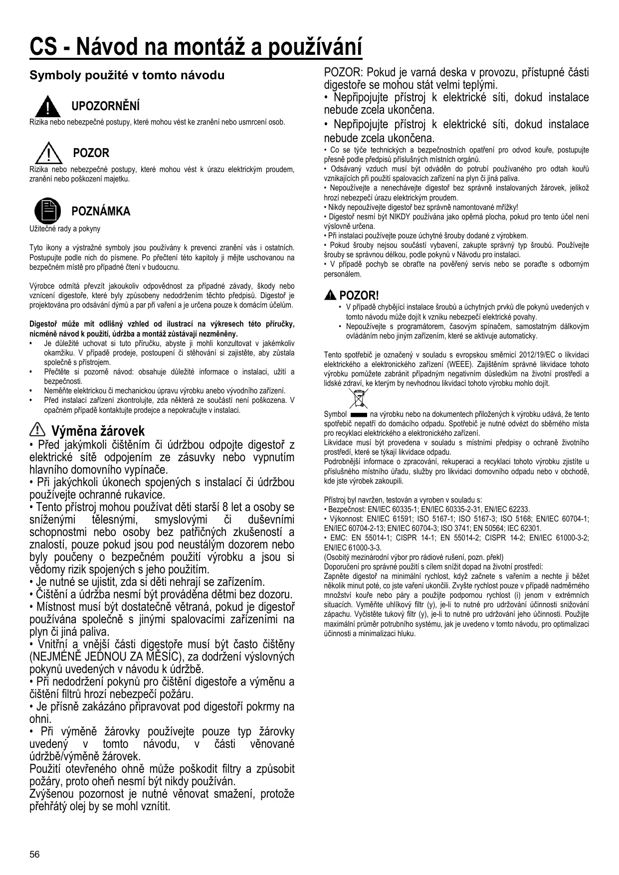 na výrobku nebo na dokumentech přiložených k výrobku udává, že tento Symbol spotřebič nepatří do domácího odpadu. Spotřebič je nutné odvézt do sběrného místa pro recyklaci elektrického a elektronického zařízení. Likvidace musí být provedena v souladu s místními předpisy o ochraně životního prostředí, které se týkají likvidace odpadu. Podrobnější informace o zpracování, rekuperaci a recyklaci tohoto výrobku zjistíte u příslušného místního úřadu, služby pro likvidaci domovního odpadu nebo v obchodě, kde jste výrobek zakoupili. Přístroj byl navržen, testován a vyroben v souladu s: • Bezpečnost: EN/IEC 60335-1; EN/IEC 60335-2-31, EN/IEC 62233. • Výkonnost: EN/IEC 61591; ISO 5167-1; ISO 5167-3; ISO 5168; EN/IEC 60704-1; EN/IEC 60704-2-13; EN/IEC 60704-3; ISO 3741; EN 50564; IEC 62301. • EMC: EN 55014-1; CISPR 14-1; EN 55014-2; CISPR 14-2; EN/IEC 61000-3-2; EN/IEC 61000-3-3. (Osobitý mezinárodní výbor pro rádiové rušení, pozn. překl) Doporučení pro správné použití s cílem snížit dopad na životní prostředí: Zapněte digestoř na minimální rychlost, když začnete s vařením a nechte ji běžet několik minut poté, co jste vaření ukončili. Zvyšte rychlost pouze v případě nadměrného množství kouře nebo páry a použijte podpornou rychlost (i) jenom v extrémních situacích. Vyměňte uhlíkový filtr (y), je-li to nutné pro udržování účinnosti snižování zápachu. Vyčistěte tukový filtr (y), je-li to nutné pro udržování jeho účinnosti. Použijte maximální průměr potrubního systému, jak je uvedeno v tomto návodu, pro optimalizaci účinnosti a minimalizaci hluku.