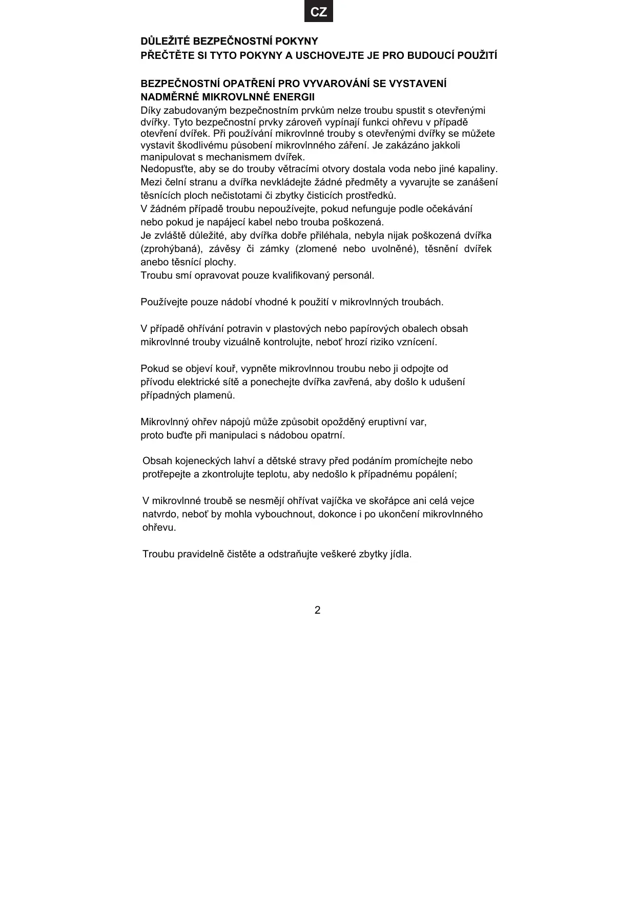 Díky zabudovaným bezpečnostním prvkům nelze troubu spustit s otevřenými dvířky. Tyto bezpečnostní prvky zároveň vypínají funkci ohřevu v případě otevření dvířek. Při používání mikrovlnné trouby s otevřenými dvířky se můžete vystavit škodlivému působení mikrovlnného záření. Je zakázáno jakkoli manipulovat s mechanismem dvířek. Nedopusťte, aby se do trouby větracími otvory dostala voda nebo jiné kapaliny. Mezi čelní stranu a dvířka nevkládejte žádné předměty a vyvarujte se zanášení těsnících ploch nečistotami či zbytky čisticích prostředků. V žádném případě troubu nepoužívejte, pokud nefunguje podle očekávání nebo pokud je napájecí kabel nebo trouba poškozená. Je zvláště důležité, aby dvířka dobře přiléhala, nebyla nijak poškozená dvířka (zprohýbaná), závěsy či zámky (zlomené nebo uvolněné), těsnění dvířek anebo těsnící plochy. Troubu smí opravovat pouze kvalifikovaný personál. Používejte pouze nádobí vhodné k použití v mikrovlnných troubách. V případě ohřívání potravin v plastových nebo papírových obalech obsah mikrovlnné trouby vizuálně kontrolujte, neboť hrozí riziko vznícení. Pokud se objeví kouř, vypněte mikrovlnnou troubu nebo ji odpojte od přívodu elektrické sítě a ponechejte dvířka zavřená, aby došlo k udušení případných plamenů. Mikrovlnný ohřev nápojů může způsobit opožděný eruptivní var, proto buďte při manipulaci s nádobou opatrní. Obsah kojeneckých lahví a dětské stravy před podáním promíchejte nebo protřepejte a zkontrolujte teplotu, aby nedošlo k případnému popálení; V mikrovlnné troubě se nesmějí ohřívat vajíčka ve skořápce ani celá vejce natvrdo, neboť by mohla vybouchnout, dokonce i po ukončení mikrovlnného ohřevu. Troubu pravidelně čistěte a odstraňujte veškeré zbytky jídla.