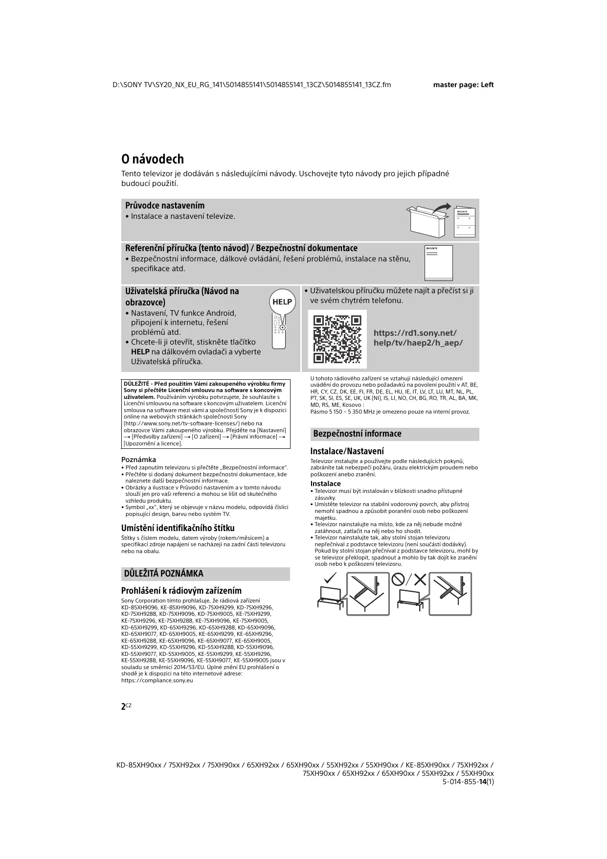 - Chcete-li ji otevřít, stiskněte tlačítko HELP na dálkovém ovladači a vyberte Uživatelská příručka. DŮLEŽITÉ - Před použitím Vámi zakoupeného výrobku firmy Sony si přečtěte Licenční smlouvu na software s koncovým uživatelem. Používáním výrobku potvrzujete, že souhlasíte s Licenční smlouvou na software s koncovým uživatelem. Licenční smlouva na software mezi vámi a společností Sony je k dispozici online na webových stránkách společnosti Sony (http://www.sony.net/tv-software-licenses/) nebo na obrazovce Vámi zakoupeného výrobku. Přejděte na [Nastavení] t [Předvolby zařízení] t [O zařízení] t [Právní informace] t [Upozornění a licence]. https://rd1.sony.net/ help/tv/haep2/h_aep/ U tohoto rádiového zařízení se vztahují následující omezení uvádění do provozu nebo požadavků na povolení použití v AT, BE, HR, CY, CZ, DK, EE, FI, FR, DE, EL, HU, IE, IT, LV, LT, LU, MT, NL, PL, PT, SK, SI, ES, SE, UK, UK (NI), IS, LI, NO, CH, BG, RO, TR, AL, BA, MK, MD, RS, ME, Kosovo : Pásmo 5 150 – 5 350 MHz je omezeno pouze na interní provoz. Bezpečnostní informace Instalace/Nastavení Poznámka
