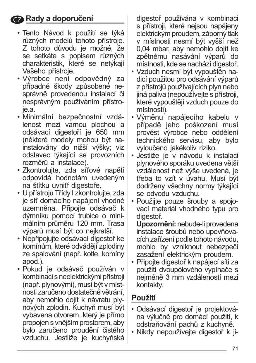 • En aucun cas le fabricant ne peut être tenu pour responsable d’éventuels dommages dus à une installation ou à une utilisation impropre. • La distance de sécurité minimum entre le plan de cuisson et la hotte aspirante est de 650 mm (certains modèles peuvent être installés à une hauteur inférieure ; voir le paragraphe concernant les dimensions de travail et l’installation). • Assurez-vous que la tension de votre secteur correspond à celle indiquée sur la plaque des données appliquée à l’intérieur de la hotte. • Pour les appareils de Classe I, s’assurer que l’installation électrique de votre intérieur dispose d’une mise à la terre adéquate. Relier l’aspirateur au conduit de cheminée avec un tube d’un diamètre minimum de 120 mm. Le parcours des fumées doit être le plus court possible. • Ne pas relier la hotte aspirante aux conduits de cheminée qui acheminent les fumées de combustion (par exemple de chaudières, de cheminées, etc.). • Si vous utilisez l’aspirateur en combinaison avec des appareils non électriques (par ex. appareils