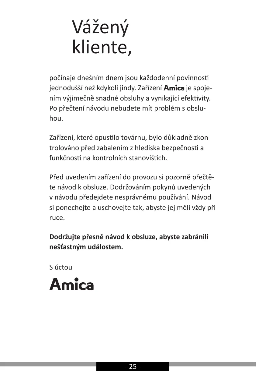 Vážený kliente, počínaje dnešním dnem jsou každodenní povinnosti jednodušší než kdykoli jindy. Zařízení je spojením výjimečně snadné obsluhy a vynikající efektivity. Po přečtení návodu nebudete mít problém s obsluhou. Zařízení, které opustilo továrnu, bylo důkladně zkontrolováno před zabalením z hlediska bezpečnosti a funkčnosti na kontrolních stanovištích. Před uvedením zařízení do provozu si pozorně přečtěte návod k obsluze. Dodržováním pokynů uvedených v návodu předejdete nesprávnému používání. Návod si ponechejte a uschovejte tak, abyste jej měli vždy při ruce. Dodržujte přesně návod k obsluze, abyste zabránili nešťastným událostem. S úctou