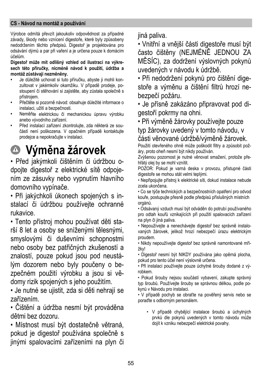 - Nepoužívejte a nenechávejte digestoř bez správně instalovaných žárovek, jelikož hrozí nebezpečí úrazu elektrickým proudem.