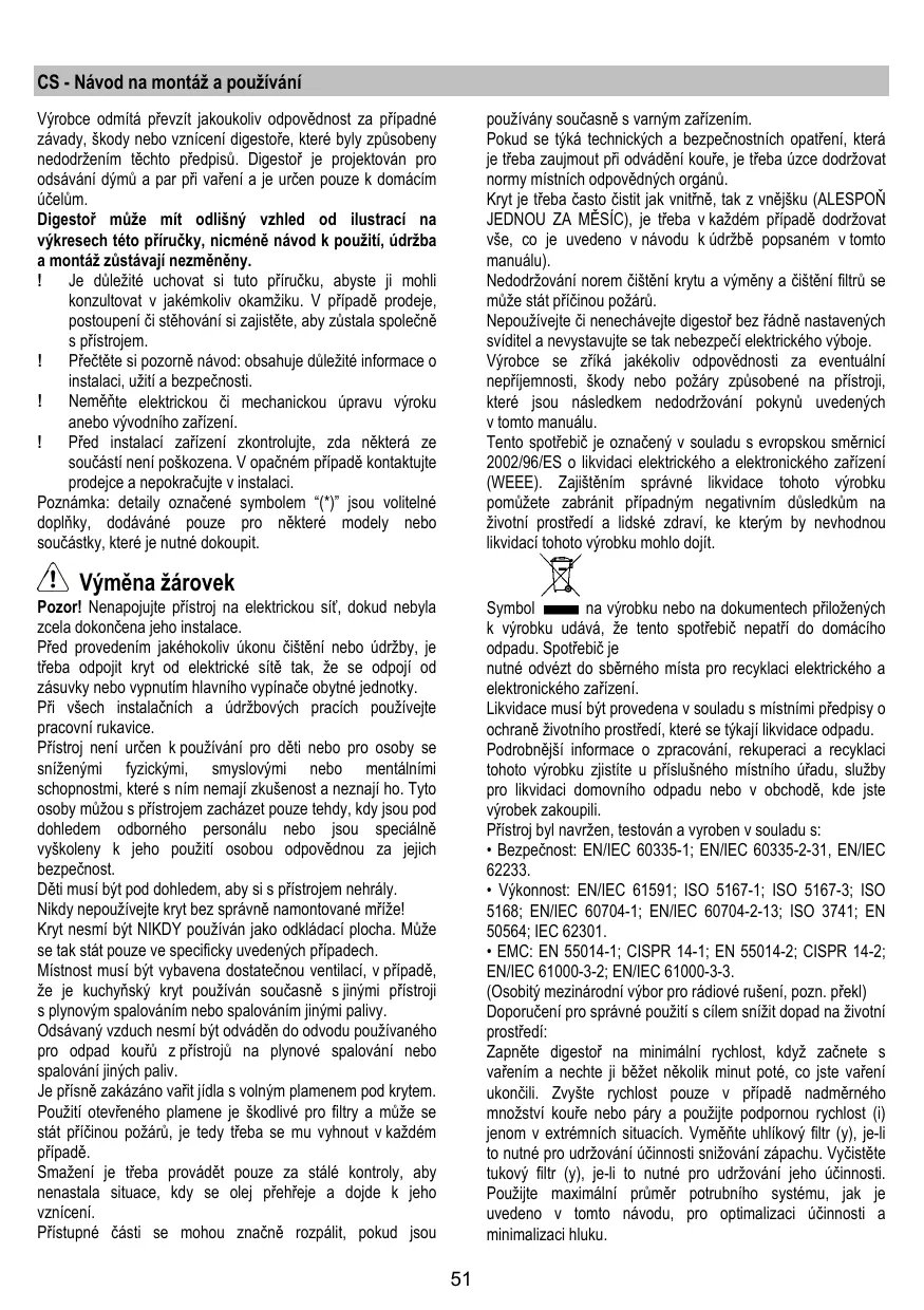 Vyrobce odmita přežit jakoukolov opodědnost za připadné závady, škody nebo vznicieni digestofe, ktere byly zpúsobeny nedodržem im těchto predpisù. Digest je projektován pro odsávací dýmù a par pri vařeni a je určen pouze k domácim učelum.