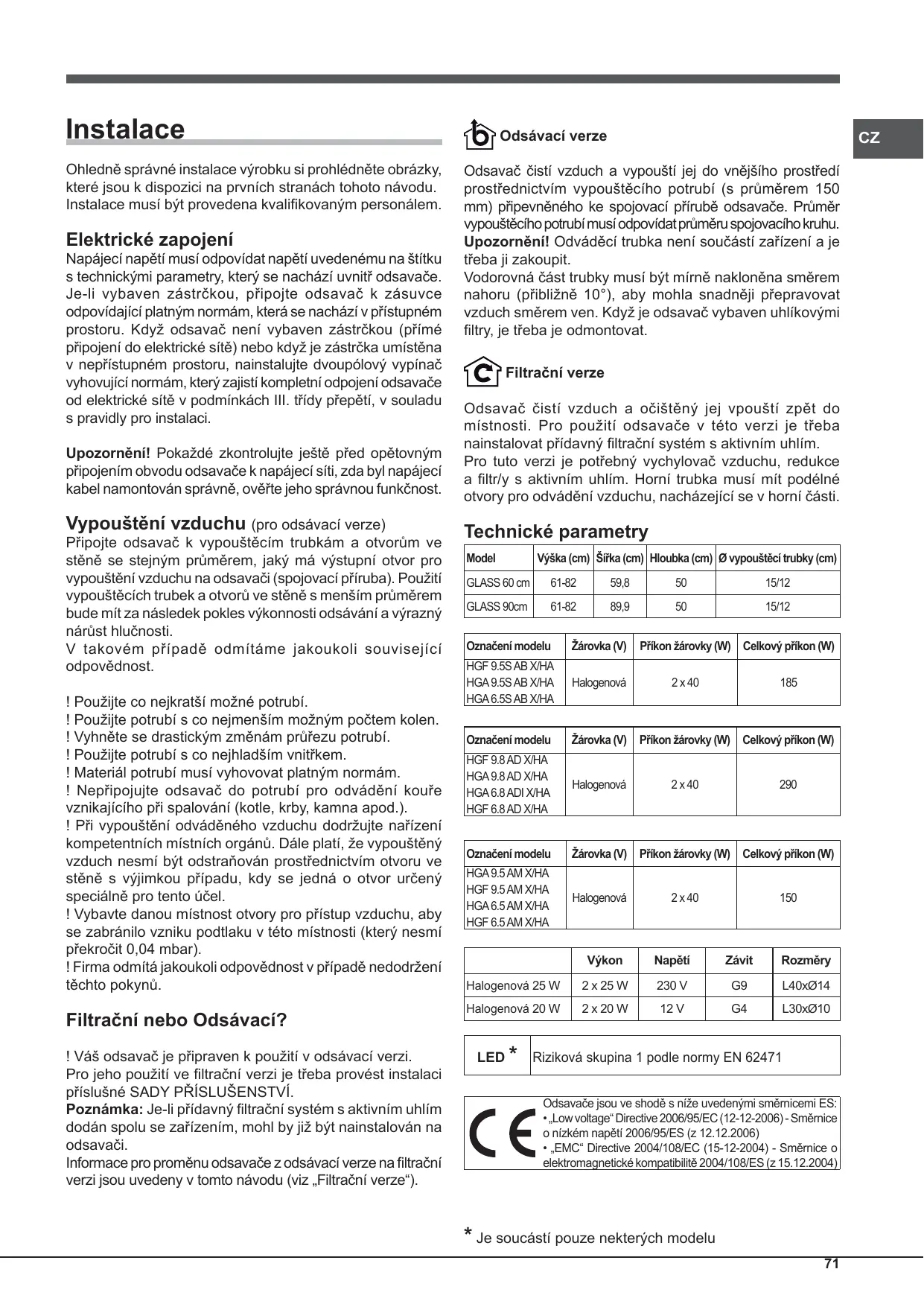 • Le non-respect des règles de nettoyage de la hotte et de remplacement et nettoyage des filtres peut être à l'origine de risques d'incendie. • N'utilisez et ne laissez pas la hotte sans ampoules correctement installées, sous peine de vous exposer à un risque de secousse électrique. • Nous déclinons toute responsabilité en cas d'éventuels inconvénients, dommages ou incendies subis par l'appareil et dérivant du non-respect des instructions présentes dans ce mode d'emploi. • Attention ! Les parties accessibles peuvent devenir très chaudes en cas d'utilisation avec des appareils de cuisson.