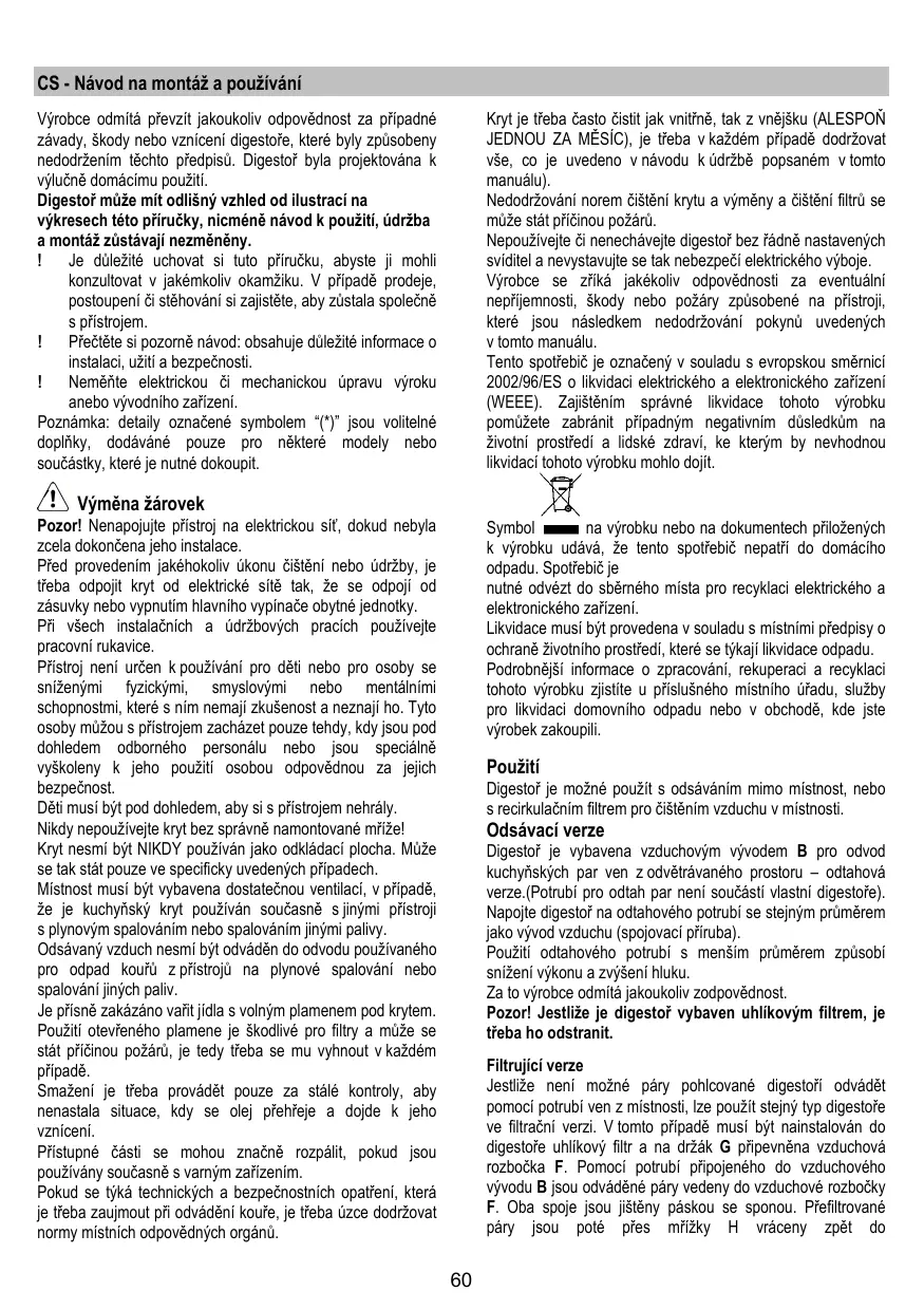 En ce qui concerne les mesures techniques et de sécurité à adopter pour l’évacuation des fumées, s’en tenir strictement à ce qui est prévu dans les règlements des autorités locales compétentes. La hotte doit être régulièrement nettoyée, aussi bien à l’intérieur qu’à l’extérieur (AU MOINS UNE FOIS PAR MOIS, respecter néanmoins les instructions relatives à l’entretien fournies dans ce manuel). La non observation de ces normes de nettoyage de la hotte et du changement et nettoyage des filtres comporte des risques d’incendie. Ne pas utiliser ou laisser la hotte sans que les ampoules soient correctement placées pour éviter tout risque de choc électrique. La société décline toute responsabilité pour d’éventuels inconvénients, dégâts ou incendies provoqués par l’appareil et dérivés de la non observation des instructions reprises dans ce manuel. Cet appareil porte le symbole du recyclage conformément à la Directive Européenne 2002/96/CE concernant les Déchets d’Équipements Électriques et Électroniques (DEEE ou WEEE). En procédant correctement à la mise au rebut de cet appareil, vous contribuerez à empêcher toute conséquence nuisible pour l’environnement et la santé de l’homme.