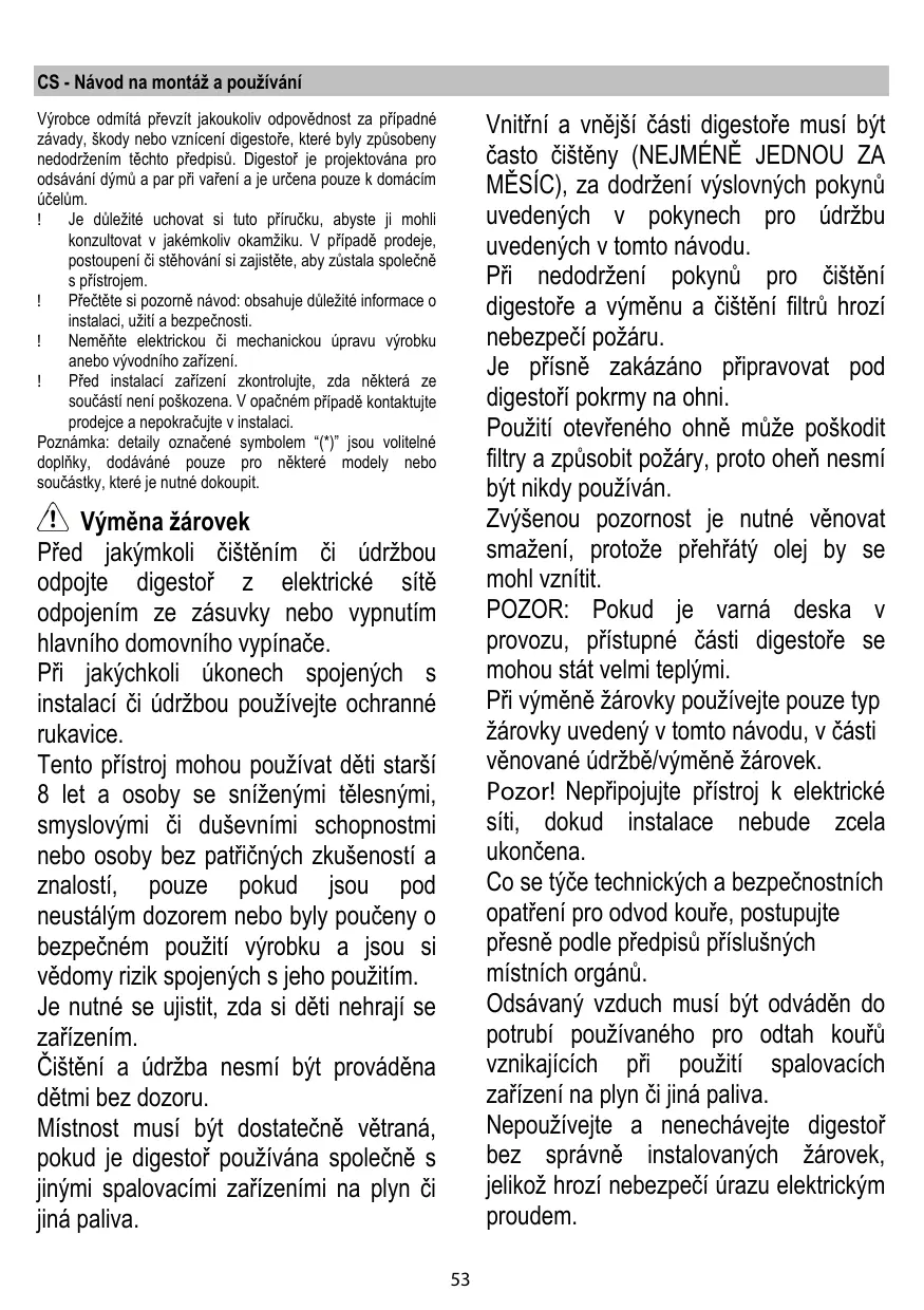 Attention! Si la hotte est livrée sans tre à charbon, celuici doit être commandé et monté avant la mise en service. Les modèles sans moteur d’aspiration fonctionnent uniquement dans la version aspirante et ils doivent être connectés à une unité périphérique d’aspiration (non fournie). Les instructions de raccordement sont fournies avec l’unité périphérique d’aspiration.