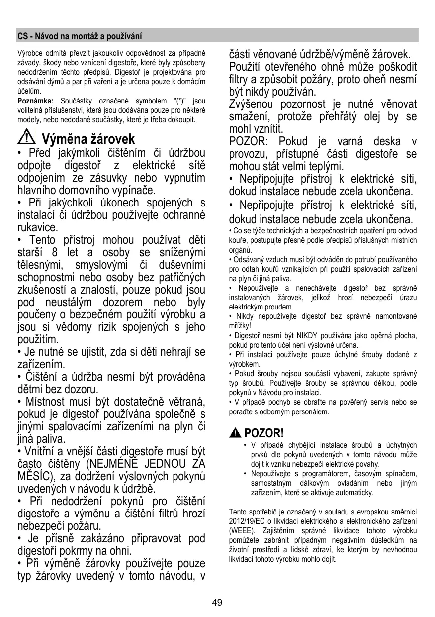 - Nepoužívejte a nenechávejte digestor bez správně instalovaných zárovek, jelíkož hrožnebezpečí urazu elektrickým proudem.