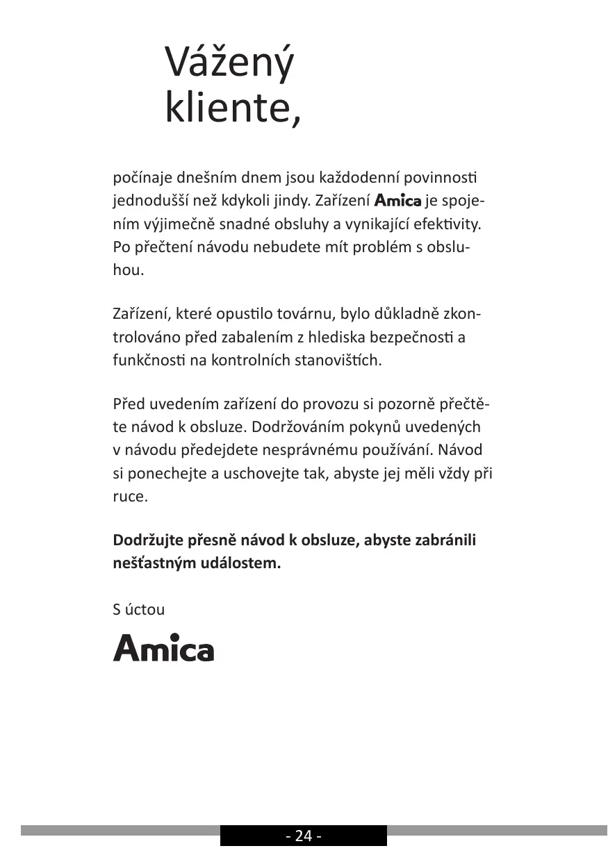 Vážený kliente, počínaje dnešním dnem jsou každodenní povinnosti jednodušší než kdykoli jindy. Zařízení je spojením výjimečně snadné obsluhy a vynikající efektivity. Po přečtení návodu nebudete mít problém s obsluhou. Zařízení, které opustilo továrnu, bylo důkladně zkontrolováno před zabalením z hlediska bezpečnosti a funkčnosti na kontrolních stanovištích. Před uvedením zařízení do provozu si pozorně přečtěte návod k obsluze. Dodržováním pokynů uvedených v návodu předejdete nesprávnému používání. Návod si ponechejte a uschovejte tak, abyste jej měli vždy při ruce. Dodržujte přesně návod k obsluze, abyste zabránili nešťastným událostem. S úctou