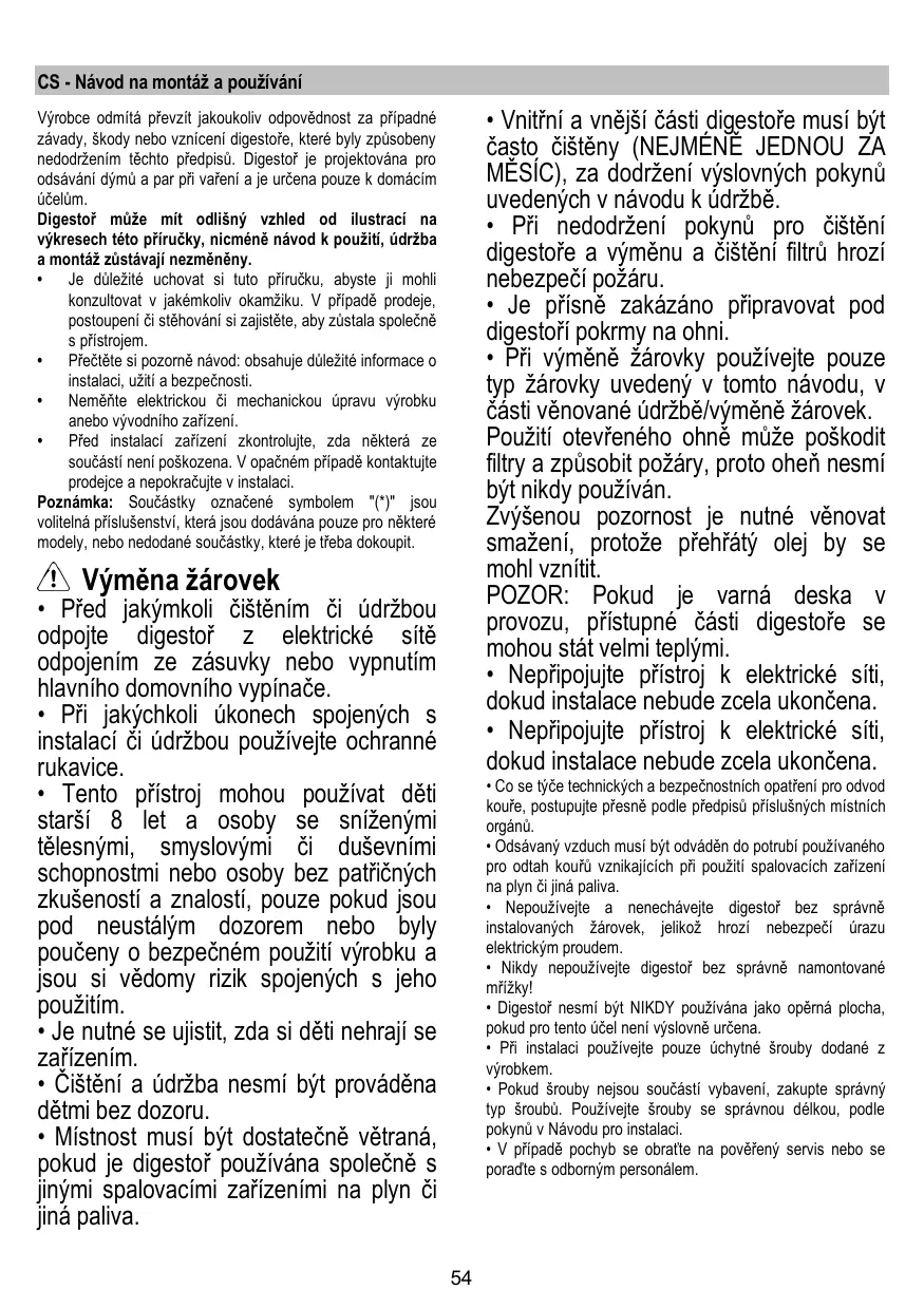• Před jakýmkoli čištěním či údržbou odpojte digestoř z elektrické sítě odpojením ze zásuvky nebo vypnutím hlavního domovního vypínače. • Při jakýchkoli úkonech spojených s instalací či údržbou používejte ochranné rukavice. • Tento přístroj mohou používat děti starší 8 let a osoby se sníženými tělesnými, smyslovými či duševními schopnostmi nebo osoby bez patřičných zkušeností a znalostí, pouze pokud jsou pod neustálým dozorem nebo byly poučeny o bezpečném použití výrobku a jsou si vědomy rizik spojených s jeho použitím. • Je nutné se ujistit, zda si děti nehrají se zařízením. • Čištění a údržba nesmí být prováděna dětmi bez dozoru. • Místnost musí být dostatečně větraná, pokud je digestoř používána společně s jinými spalovacími zařízeními na plyn či jiná paliva.