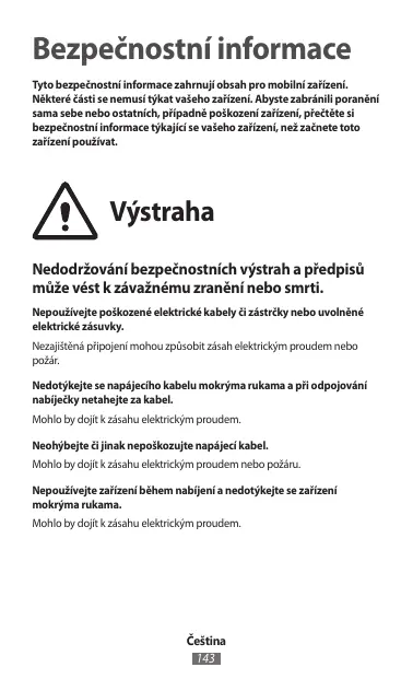 Výstraha Nedodržování bezpečnostních výstrah a předpisů může vést k závažnému zranění nebo smrti. Nepoužívejte poškozené elektrické kabely či zástrčky nebo uvolněné elektrické zásuvky. Nezajištěná připojení mohou způsobit zásah elektrickým proudem nebo požár. Nedotýkejte se napájecího kabelu mokrýma rukama a při odpojování nabíječky netahejte za kabel. Mohlo by dojít k zásahu elektrickým proudem. Neohýbejte či jinak nepoškozujte napájecí kabel. Mohlo by dojít k zásahu elektrickým proudem nebo požáru. Nepoužívejte zařízení během nabíjení a nedotýkejte se zařízení mokrýma rukama. Mohlo by dojít k zásahu elektrickým proudem.
