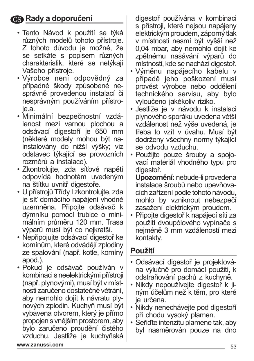 CS Rady a doporučení • Tento Návod k použití se týká různých modelů tohoto přístroje. Z tohoto důvodu je možné, že se setkáte s popisem různých charakteristik, které se netýkají Vašeho přístroje. • Výrobce není odpovědný za případné škody způsobené nesprávně provedenou instalací či nesprávným používáním přístroje.a. • Minimální bezpečnostní vzdálenost mezi varnou plochou a odsávací digestoří je 650 mm (některé modely mohou být nainstalovány do nižší výšky; viz odstavec týkající se provozních rozměrů a instalace). • Zkontrolujte, zda síťové napětí odpovídá hodnotám uvedeným na štítku uvnitř digestoře. • U přístrojů Třídy I zkontrolujte, zda je síť domácího napájení vhodně uzemněna. Připojte odsávač k dýmníku pomocí trubice o minimálním průměru 120 mm. Trasa výparů musí být co nejkratší. • Nepřipojujte odsávací digestoř ke komínům, které odvádějí zplodiny ze spalování (např. kotle, komíny apod.). • Pokud je odsávač používán v kombinaci s neelektrickými přístroji (např. plynovými), musí být v místnosti zaručeno dostatečné větrání, aby nemohlo dojít k návratu plynových zplodin. Kuchyň musí být vybavena otvorem, který je přímo propojen s vnějším prostorem, aby bylo zaručeno proudění čistého vzduchu. Jestliže je kuchyňská www.zanussi.com