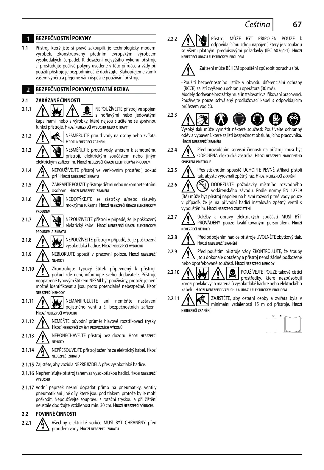 Sur les surfaces verticales, partir du bas vers le haut. Laisser agir pendant 1÷2 minutes, sans laisser sécher la surface. Pulvériser un jet à haute pression à une distance de plus de 30 cm, en commençant par le bas. Éviter que l’eau de rinçage coule sur les surfaces non lavées. Dans certains cas, pour enlever la saleté, l’action mécanique des brosses est nécessaire. La pression élevée n’est pas toujours la meilleure solution pour un bon lavage, car elle peut endommager certaines surfaces. Il est conseillé d’éviter l’utilisation du jet fin de la tête réglable et de la buse rotative sur des parties délicates et peintes et sur des composants sous pression (ex. pneumatiques, valves de gonflage..). Un bon lavage dépend, en mesure égale, de la pression et du volume d’eau.