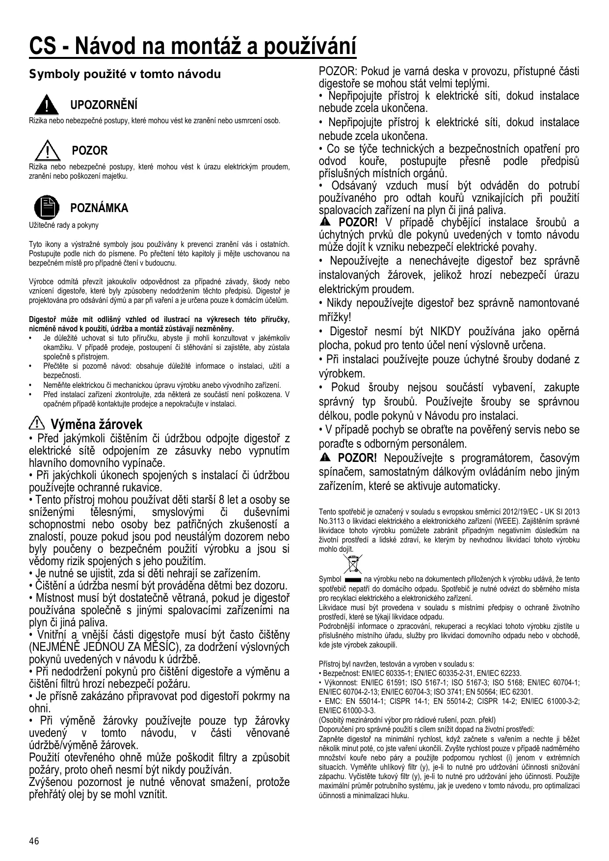POZOR: Pokud je varná deska v provozu, přístupné části digestoře se mohou stát velmi teplými. • Nepřipojujte přístroj k elektrické síti, dokud instalace nebude zcela ukončena. • Nepřipojujte přístroj k elektrické síti, dokud instalace nebude zcela ukončena. • Co se týče technických a bezpečnostních opatření pro odvod kouře, postupujte přesně podle předpisů příslušných místních orgánů. • Odsávaný vzduch musí být odváděn do potrubí používaného pro odtah kouřů vznikajících při použití spalovacích zařízení na plyn či jiná paliva. POZOR! V případě chybějící instalace šroubů a úchytných prvků dle pokynů uvedených v tomto návodu může dojít k vzniku nebezpečí elektrické povahy. • Nepoužívejte a nenechávejte digestoř bez správně instalovaných žárovek, jelikož hrozí nebezpečí úrazu elektrickým proudem. • Nikdy nepoužívejte digestoř bez správně namontované mřížky! • Digestoř nesmí být NIKDY používána jako opěrná plocha, pokud pro tento účel není výslovně určena. • Při instalaci používejte pouze úchytné šrouby dodané z výrobkem. • Pokud šrouby nejsou součástí vybavení, zakupte správný typ šroubů. Používejte šrouby se správnou délkou, podle pokynů v Návodu pro instalaci. • V případě pochyb se obraťte na pověřený servis nebo se poraďte s odborným personálem. POZOR! Nepoužívejte s programátorem, časovým spínačem, samostatným dálkovým ovládáním nebo jiným zařízením, které se aktivuje automaticky. Tento spotřebič je označený v souladu s evropskou směrnicí 2012/19/EC - UK SI 2013 No.3113 o likvidaci elektrického a elektronického zařízení (WEEE). Zajištěním správné likvidace tohoto výrobku pomůžete zabránit případným negativním důsledkům na životní prostředí a lidské zdraví, ke kterým by nevhodnou likvidací tohoto výrobku mohlo dojít.